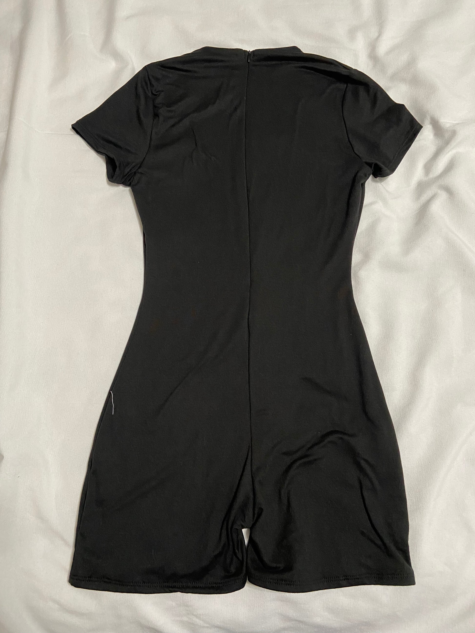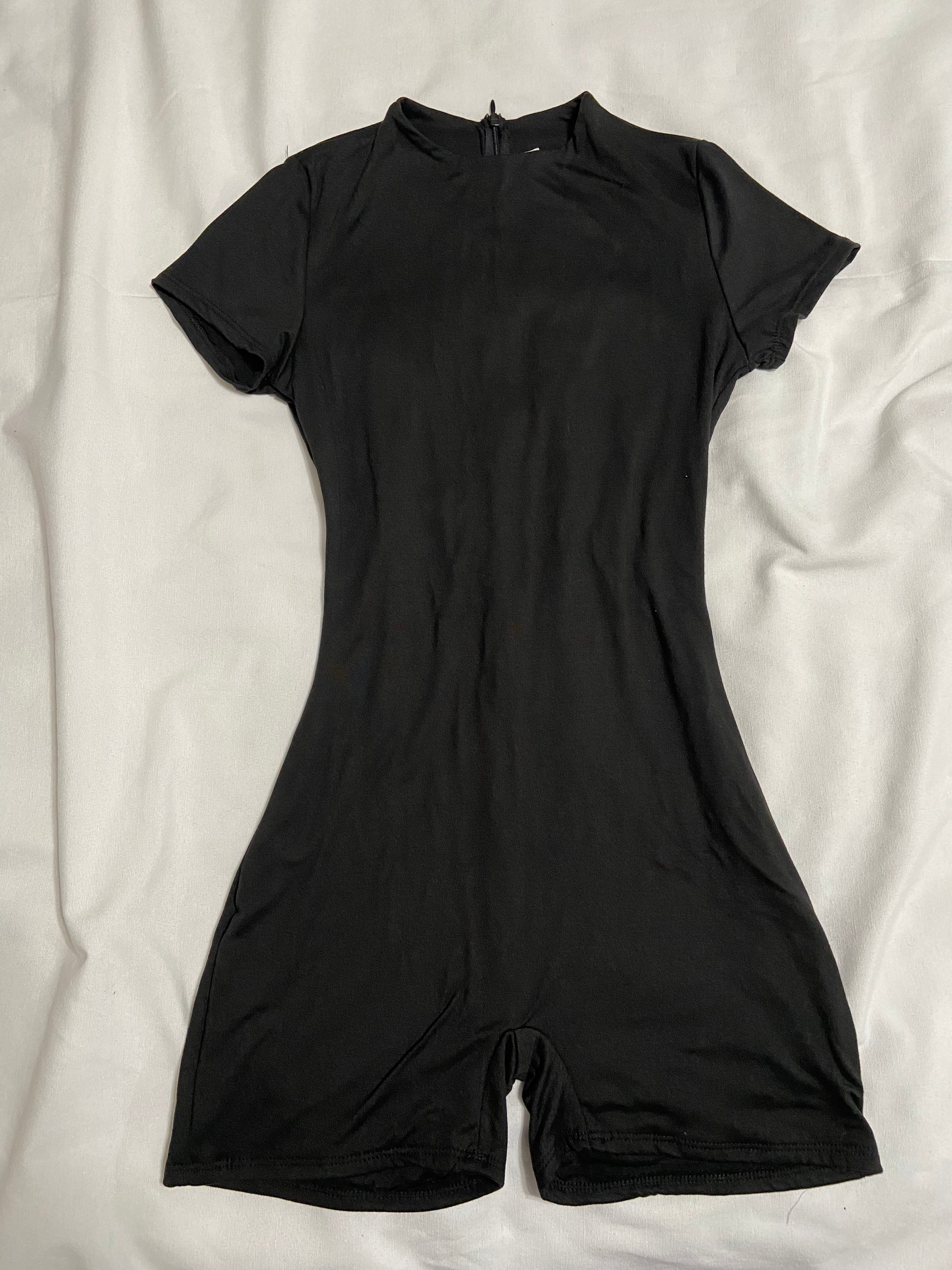 Black short sleeve double layered romper with a zipper back. Stretchy and form fitting.