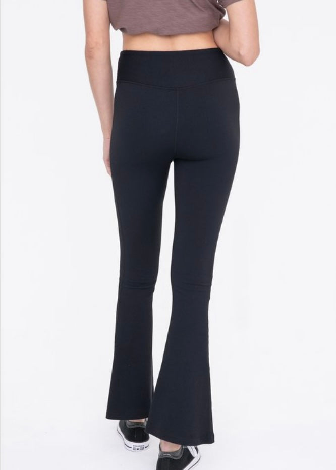 Black flared ribbed legging pants that are very stretchy. High waisted.