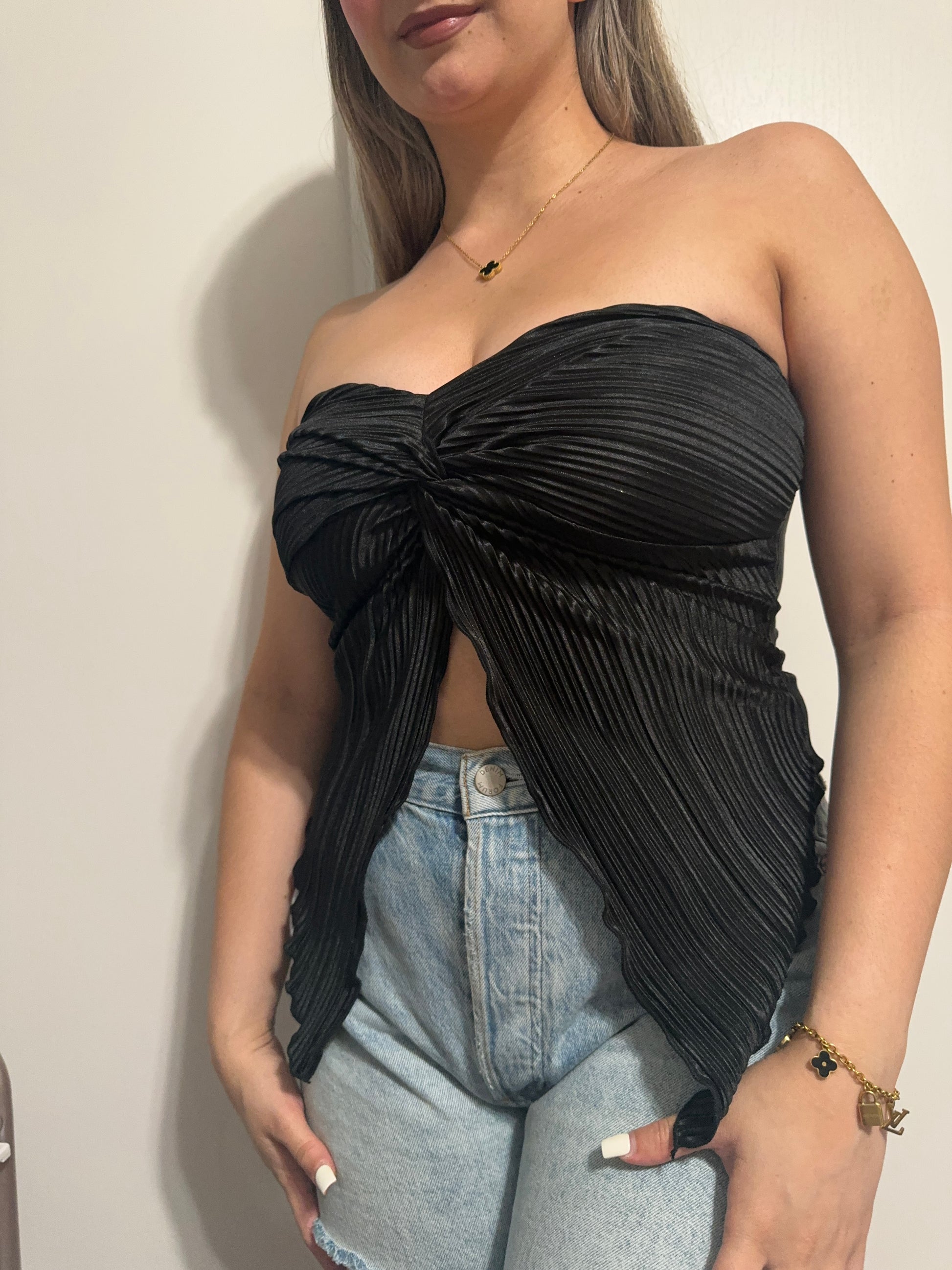 Black twist front ribbed tube top with a satin fabric. Minimal stretch. Straight back.