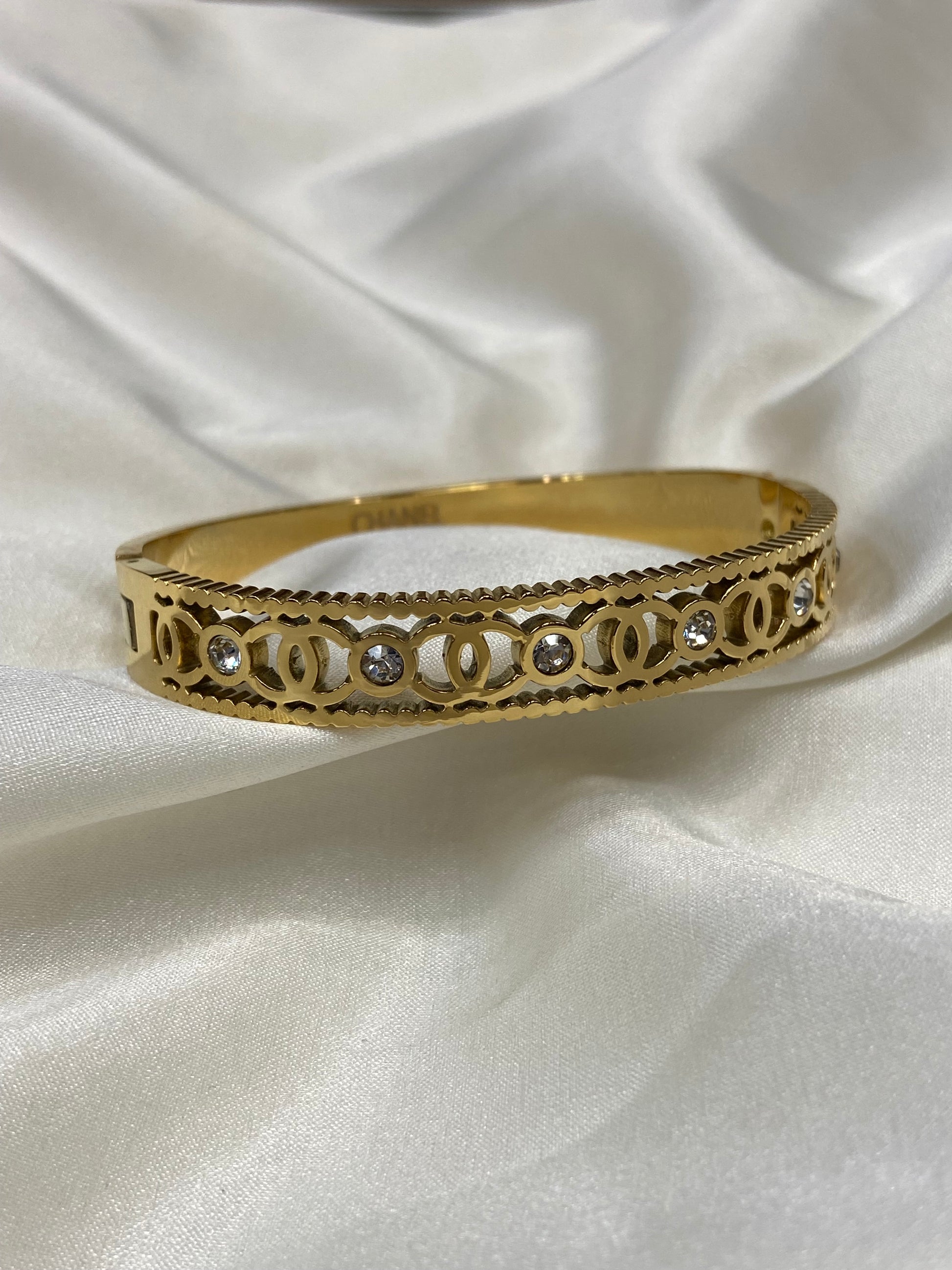 CC stainless steel gold bangle with cz stones in between. High quality bangle that is non tarnish and water friendly. Stainless steel over gold plating. Plain in the back.