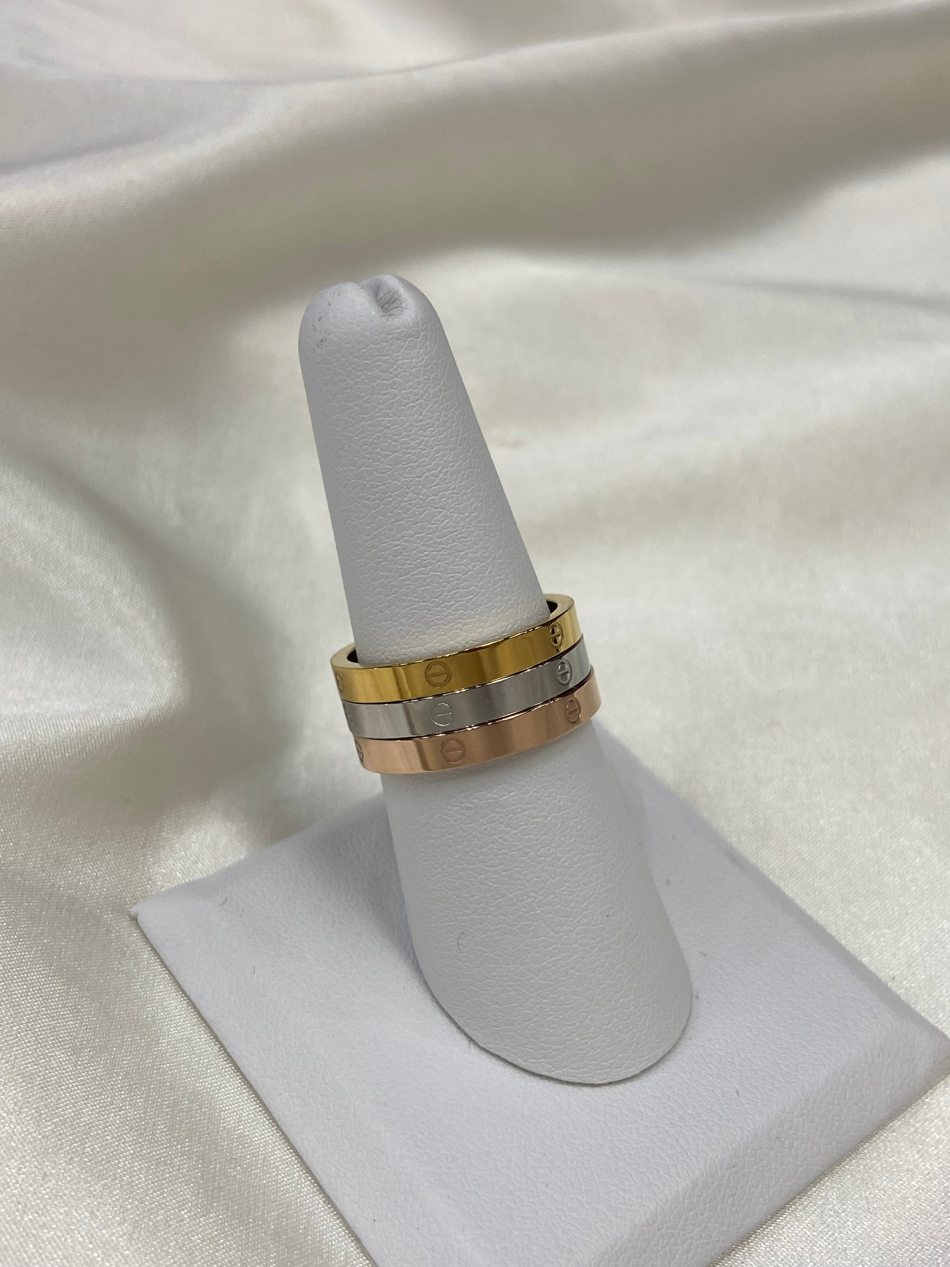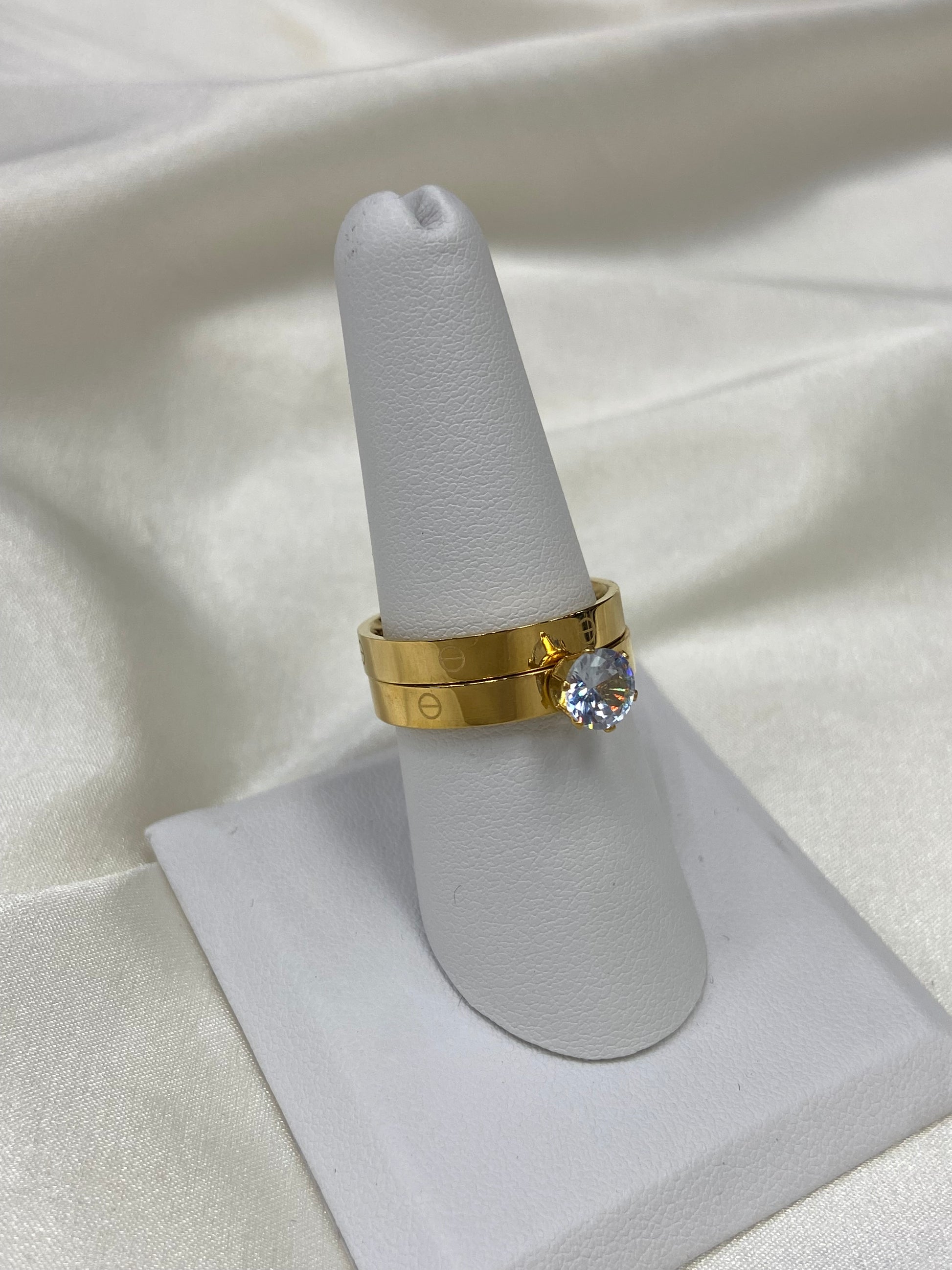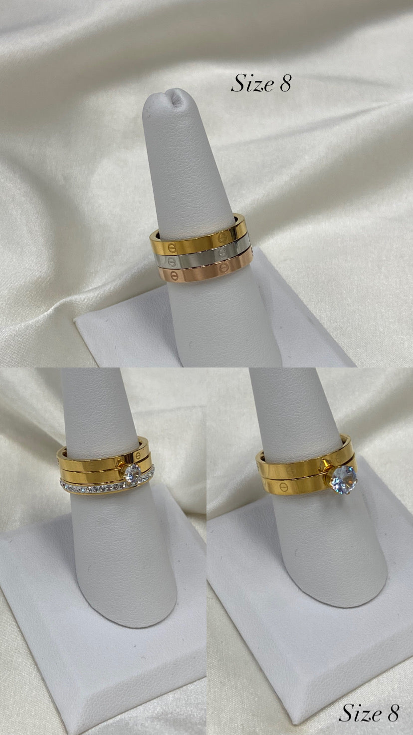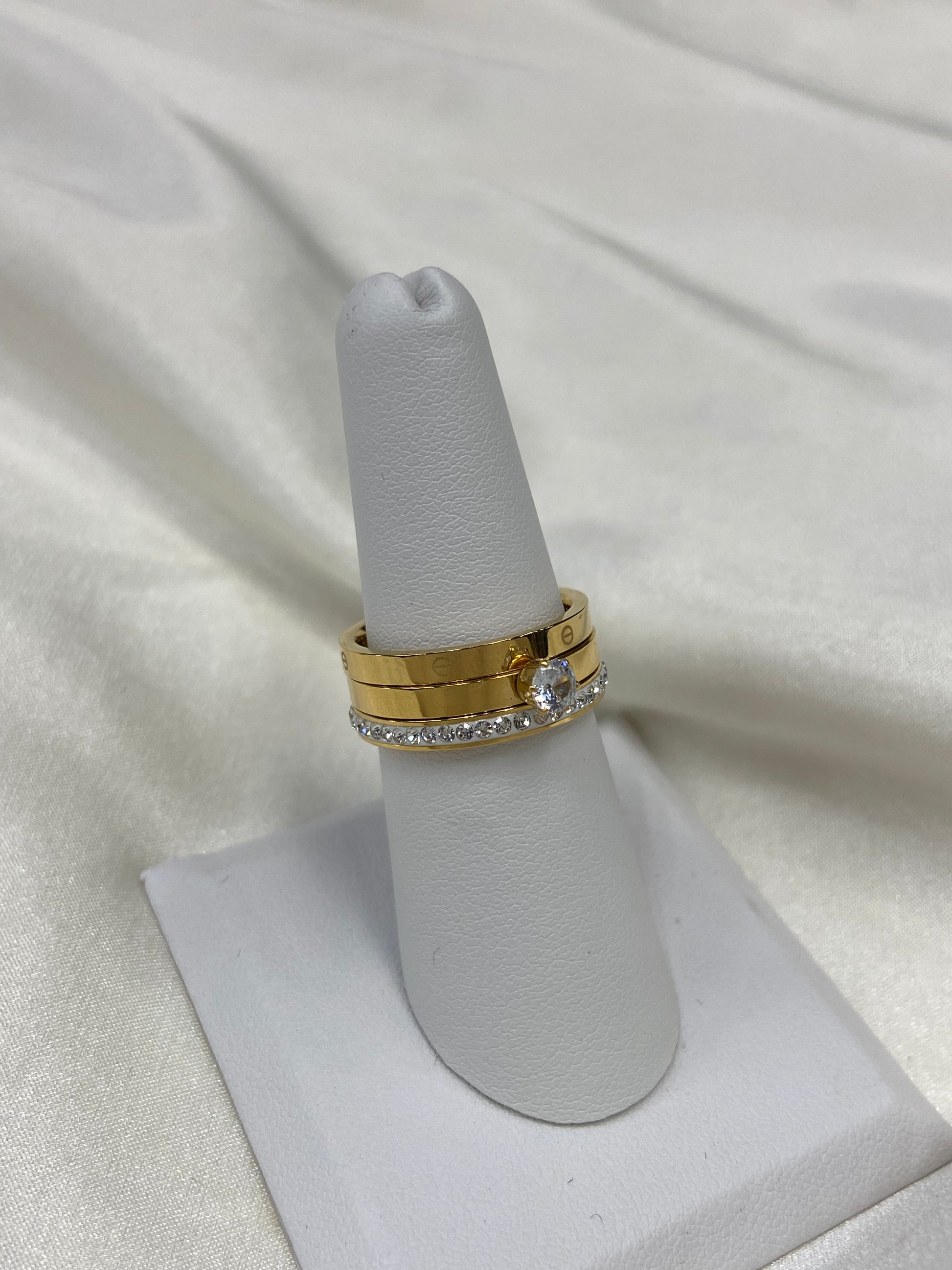 Gold carti stainless steel layered ring that is high quality, non tarnish, and water friendly. Stainless steel over gold plating. All rings are sold as a set. Rings are layered but not attached.