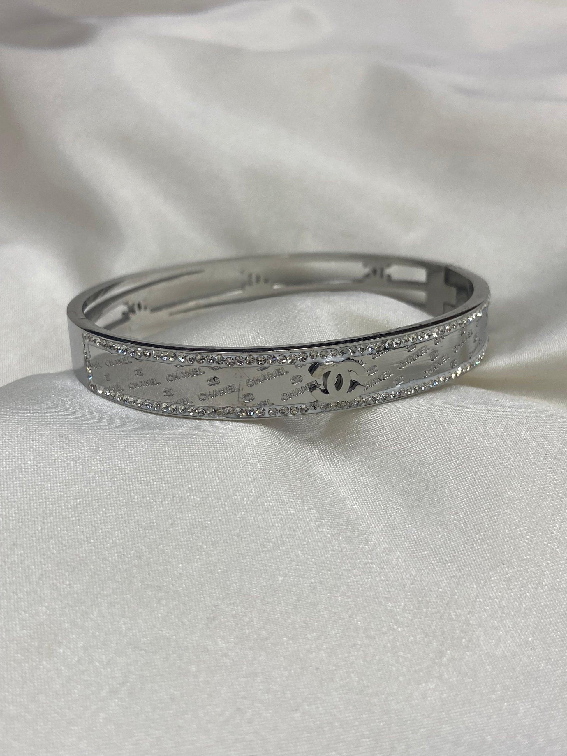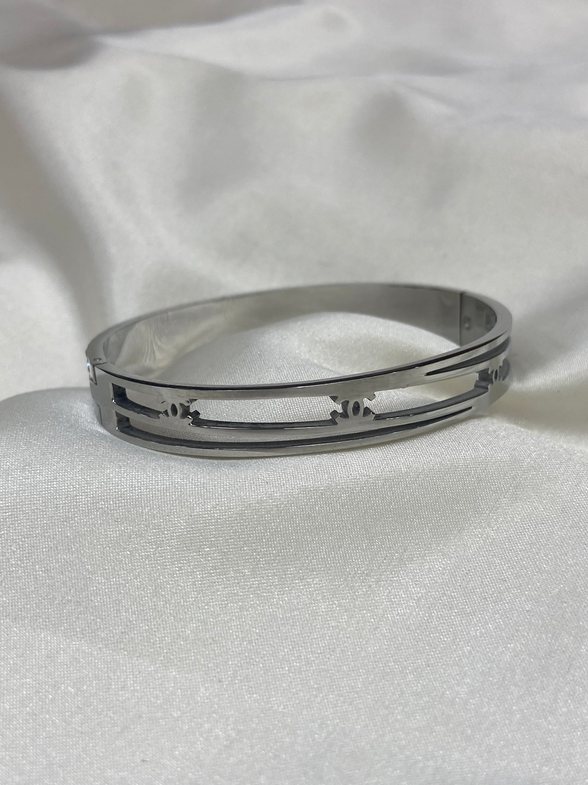 CC silver cz stainless steel bangle that is high quality, non tarnish, and water friendly.