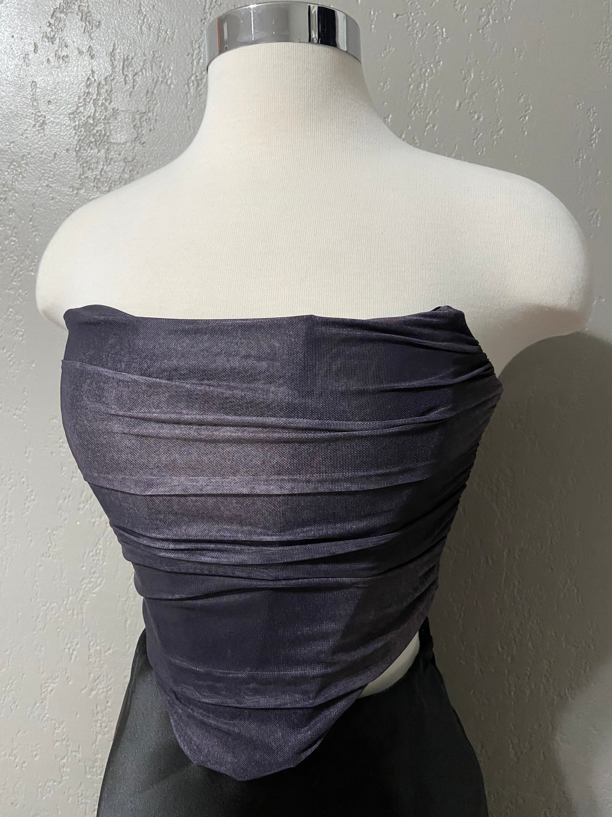 Charcoal mesh contrast print corset. Asymmetrical hem design with a hook and eye closure. No line sheer material.