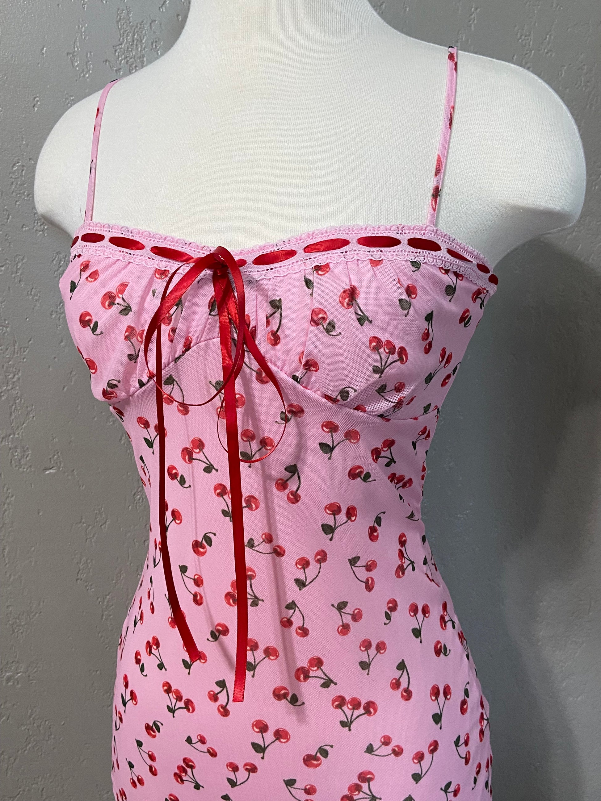 Pink mini mesh material dress that has a cherry print all around. Front scoop with a satin ribbon tie. Straight back cutout. No adjustable straps