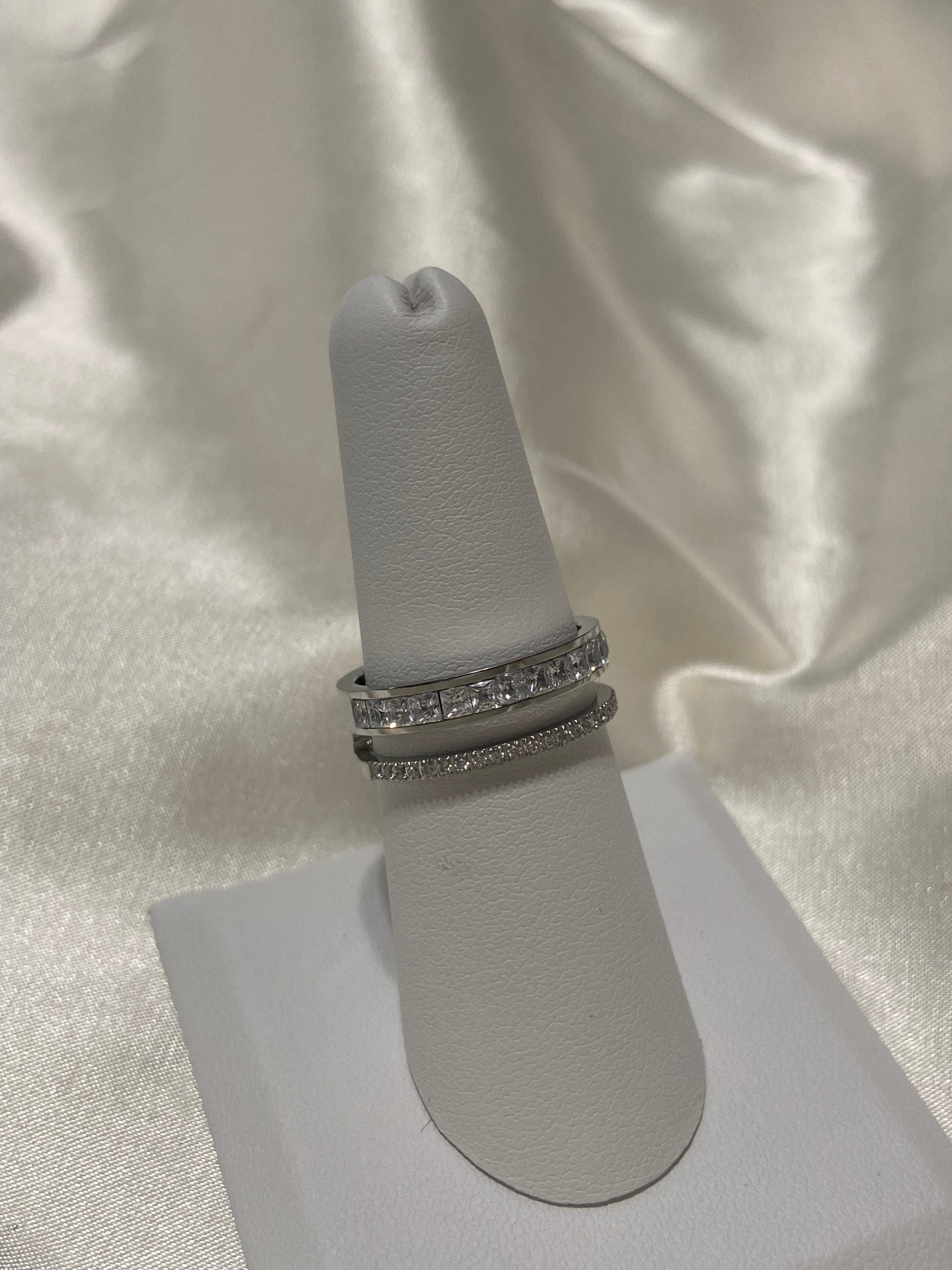 Chunky CZ layered stainless steel silver ring that is non tarnish and water friendly. Plain band in the back; no cz.