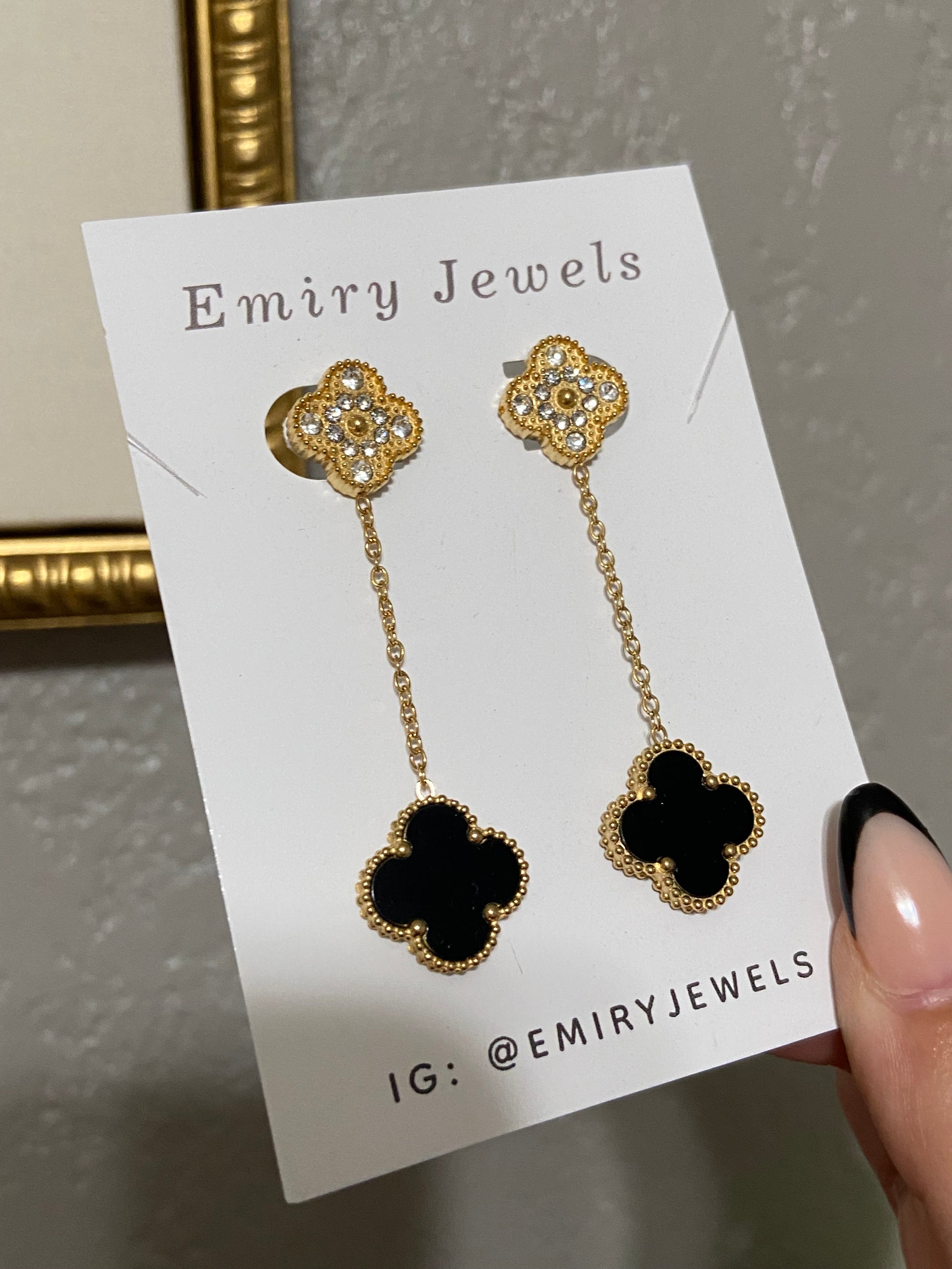 Double clover drop stainless steel gold earrings that are high quality, non tarnish, and water friendly. Stainless steel over gold plating. Black clover is double sided. Comes with a box.