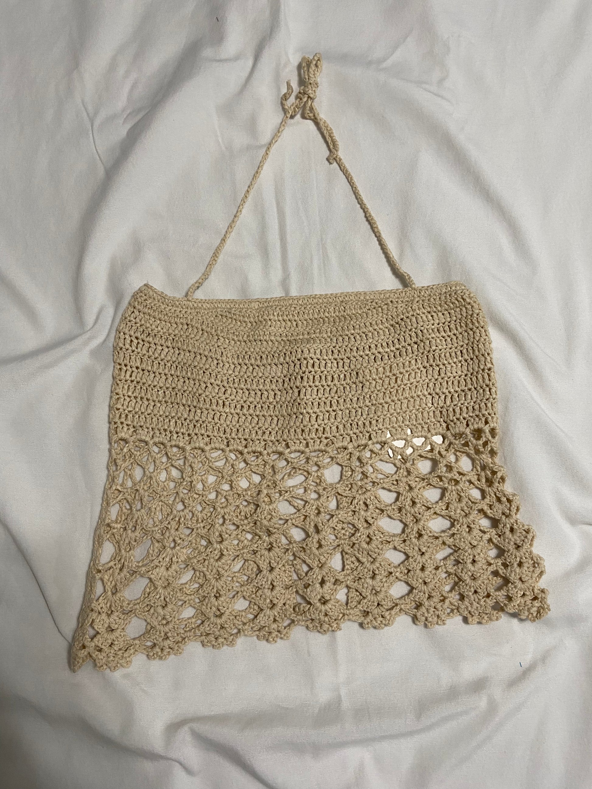 Cream crotchet sweater knit tank top with adjustable halter tie. Lace up detail at back and very stretchy. Semi sheer.
