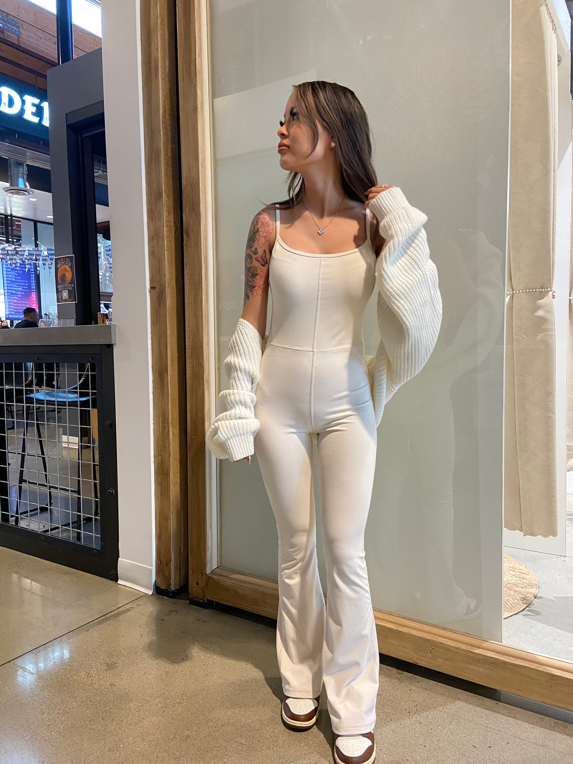 Cream flared jumpsuit in a beautiful stretchy material that is gym-like material. Has adjustable straps.