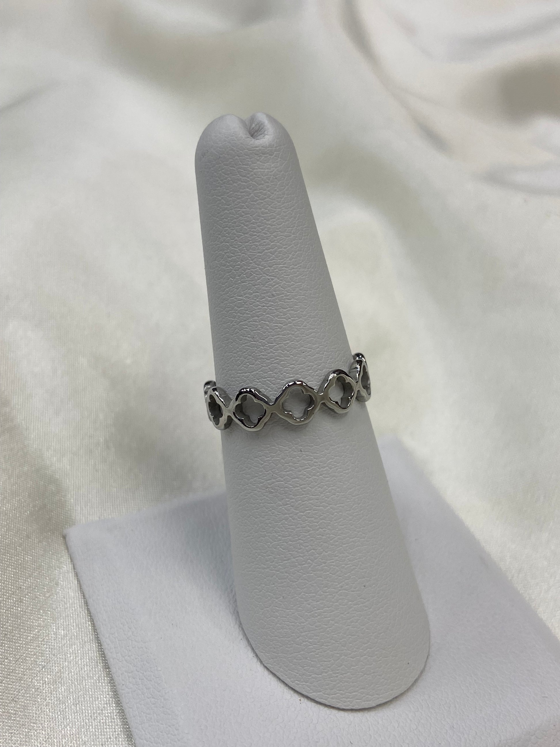 Dainty clovers stainless steel silver ring with clovers all around. Our ring is non tarnish and water friendly.