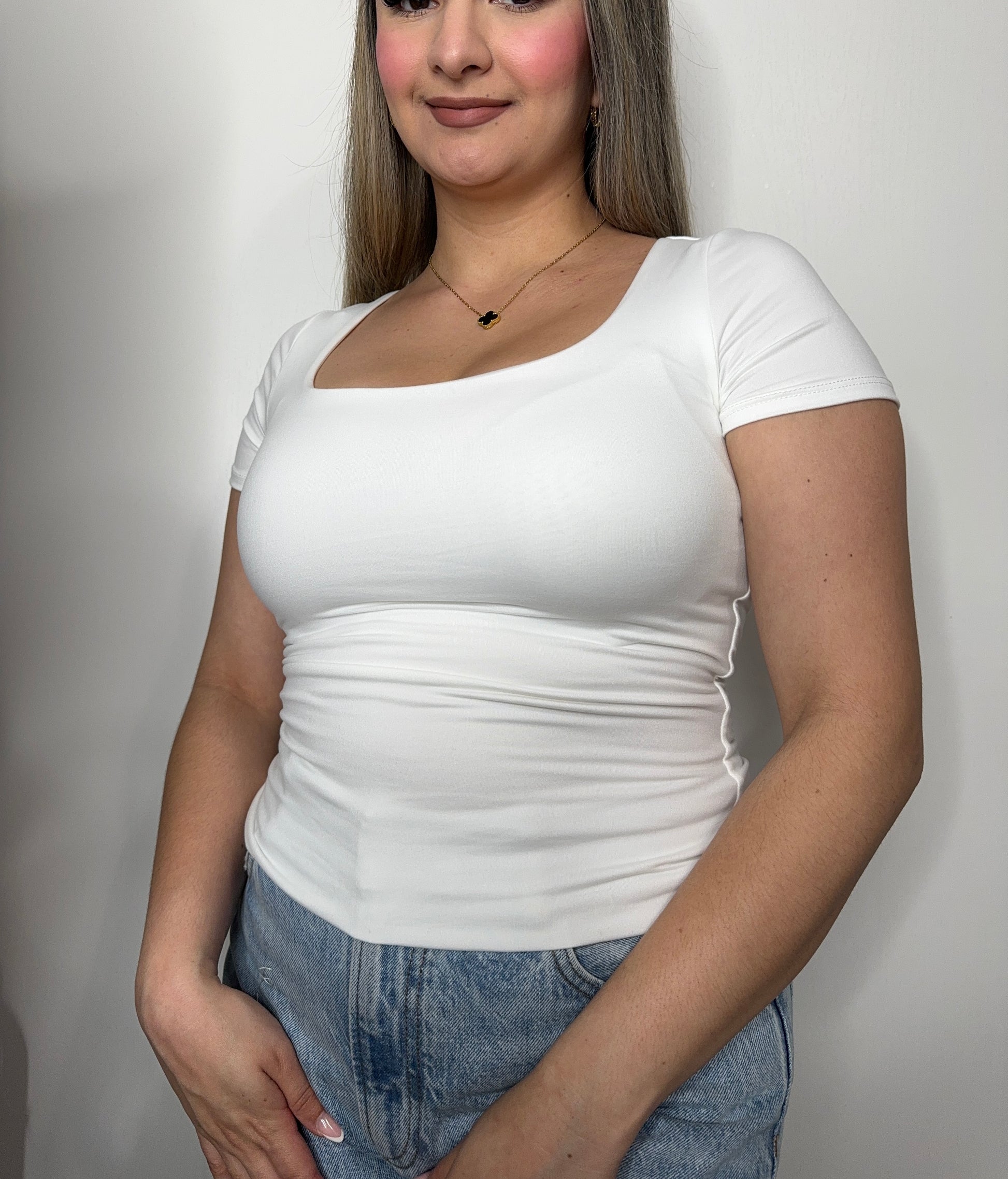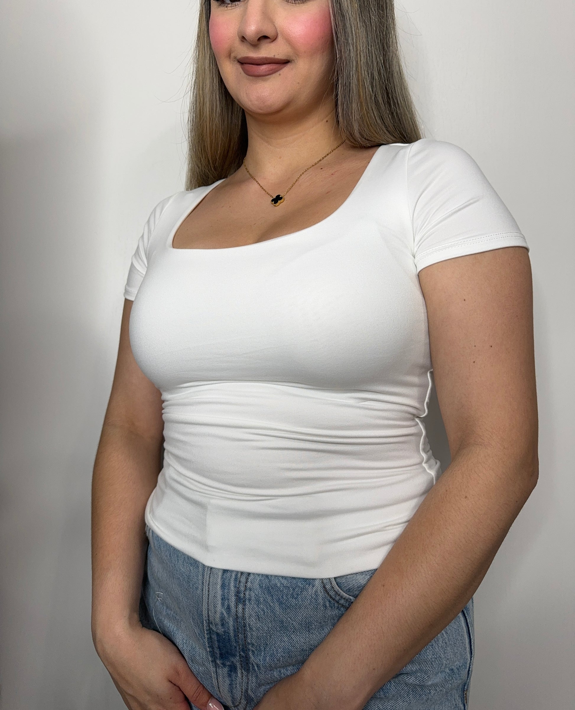 Double layered short sleeve top in white. Low scoop neckline. Buttery soft and stretchy.