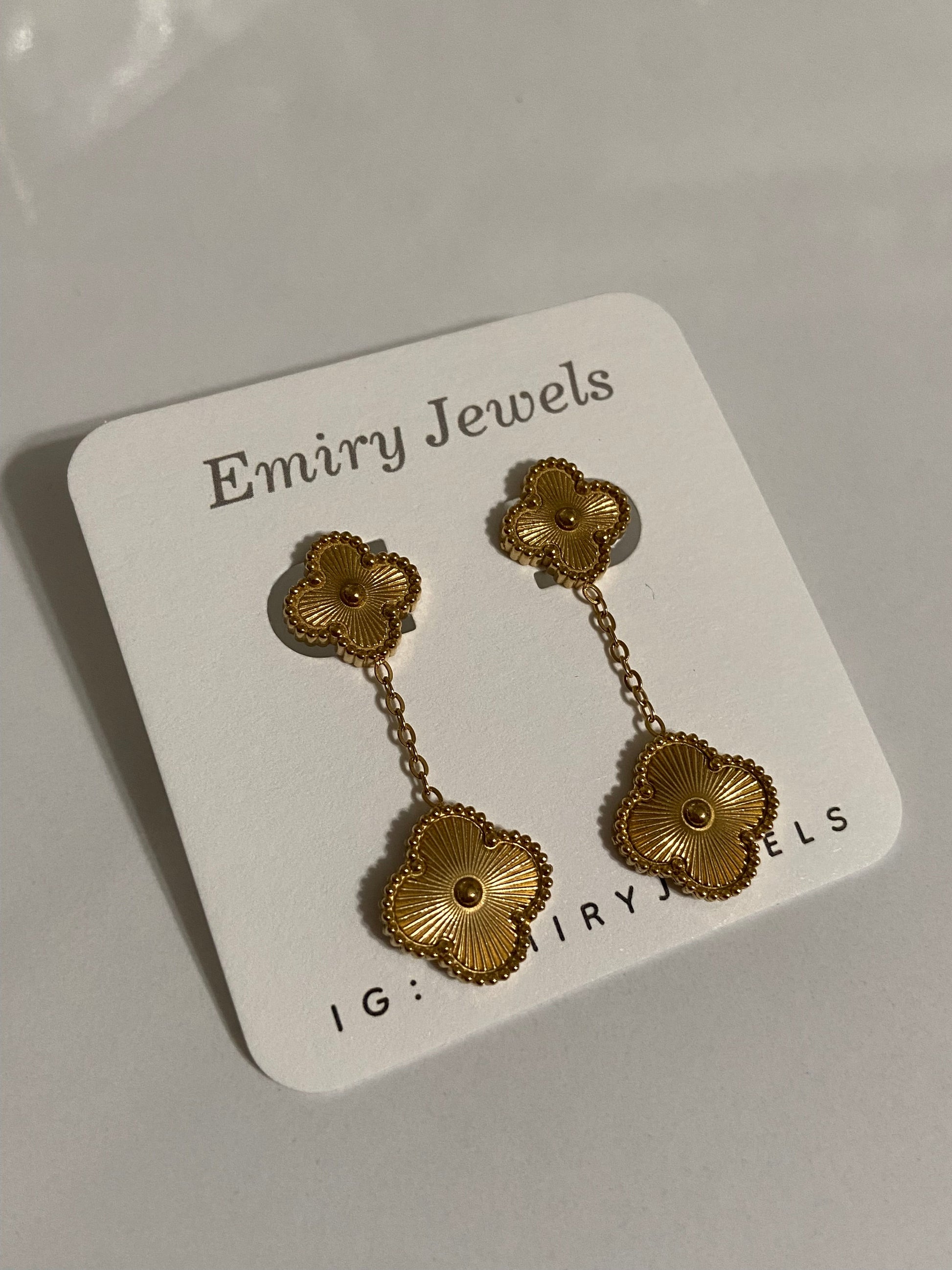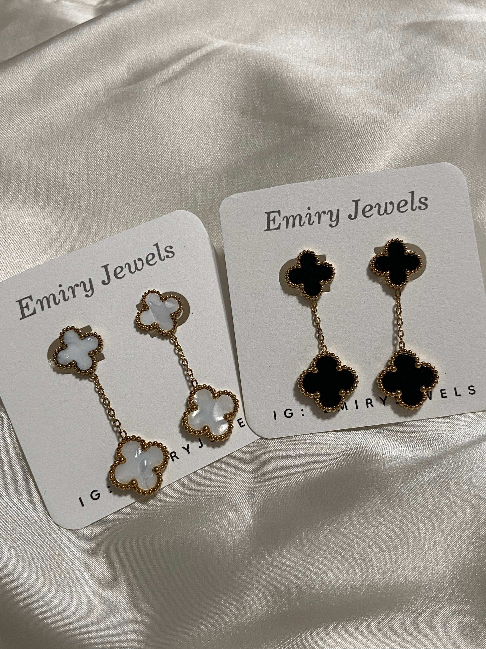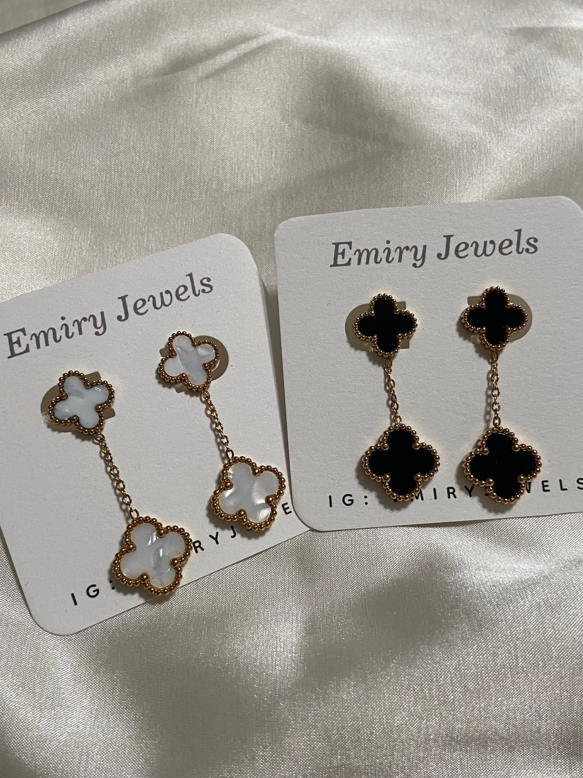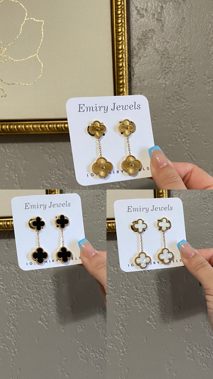 Stainless steel drop gold earrings with 2 clovers that are high quality, non tarnish, and water friendly. Stainless steel over gold plating. Available in 2 colors: black & white mother of pearl. Comes with a box.