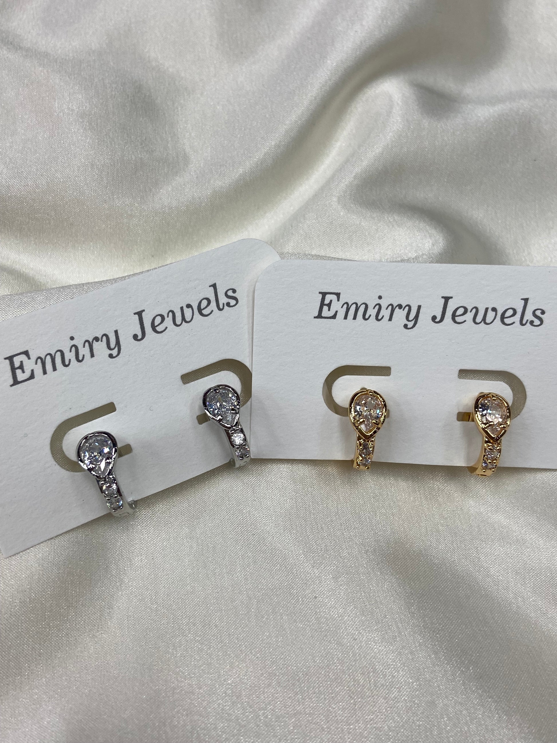Silver upside down pear shape hoop earrings. CZ. Rhodium-plated. Non tarnish, hypoallergenic, and safe for sensitive skin.