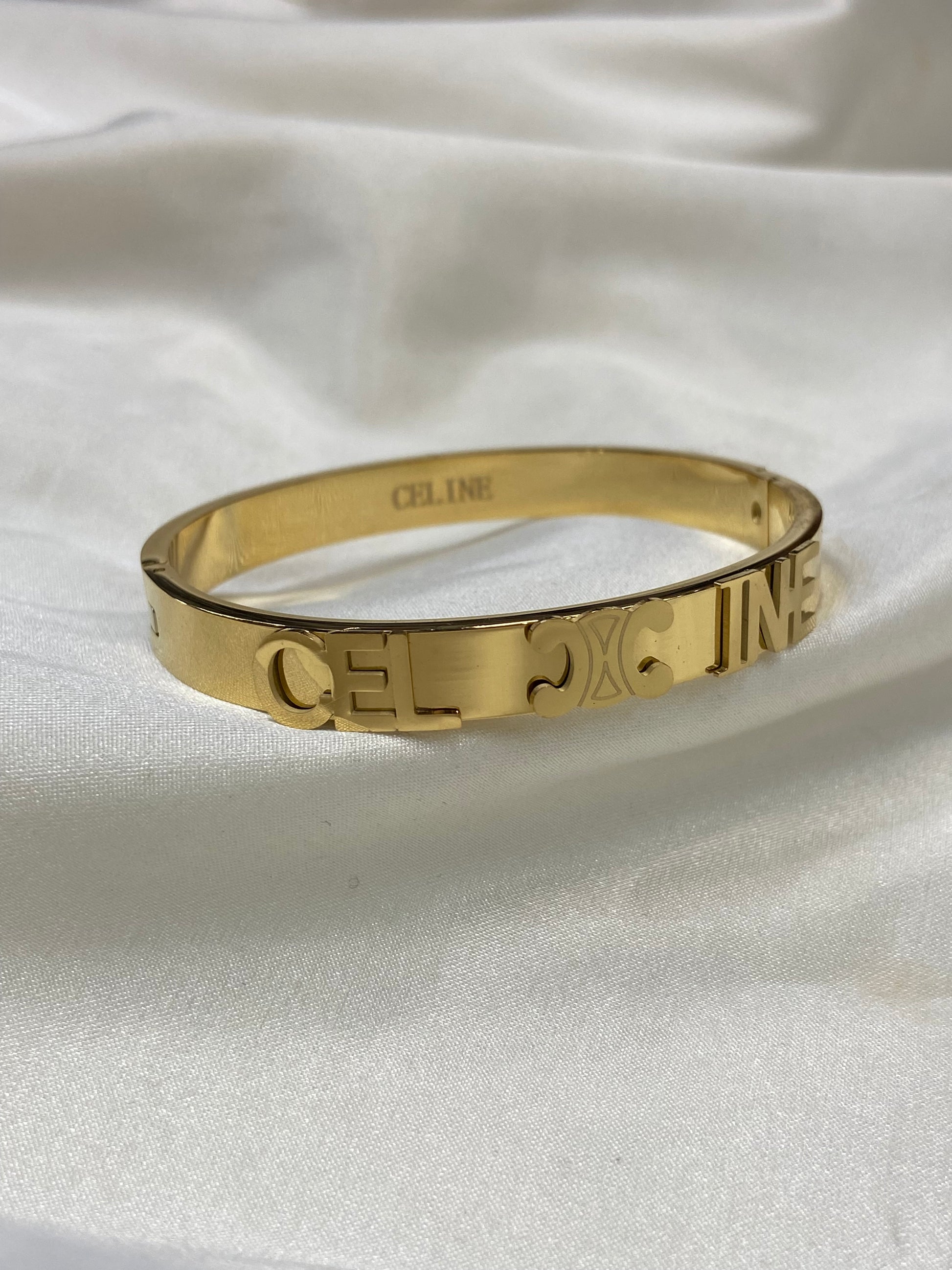 Gold Celin stainless steel bangle that is high quality, non tarnish, and water friendly. Stainless steel over gold plating.
