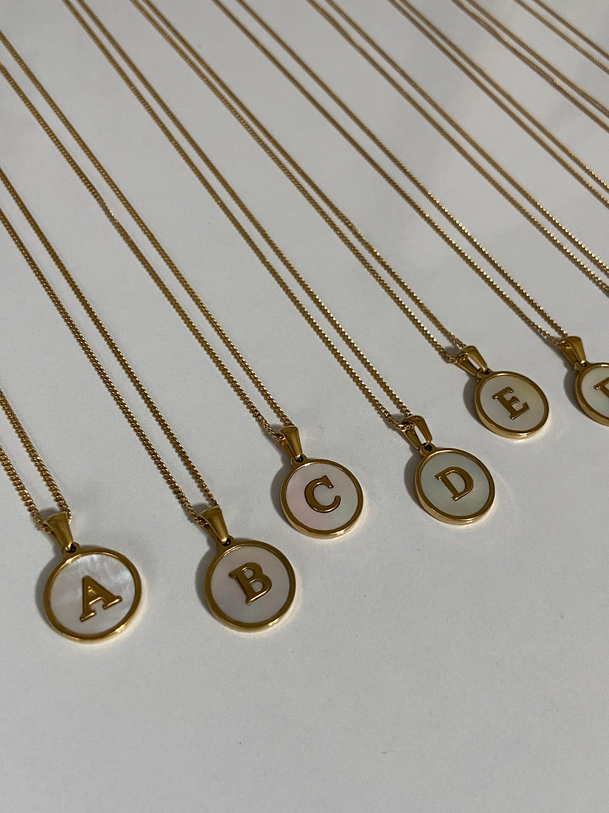 Gold initial letters necklace on a circle mother of pearl pendant. Necklaces is available in 2 different flat curb chain option length: 18" or 20". Pendant is removable. Our stunning necklace is high quality, non tarnish, and water friendly.