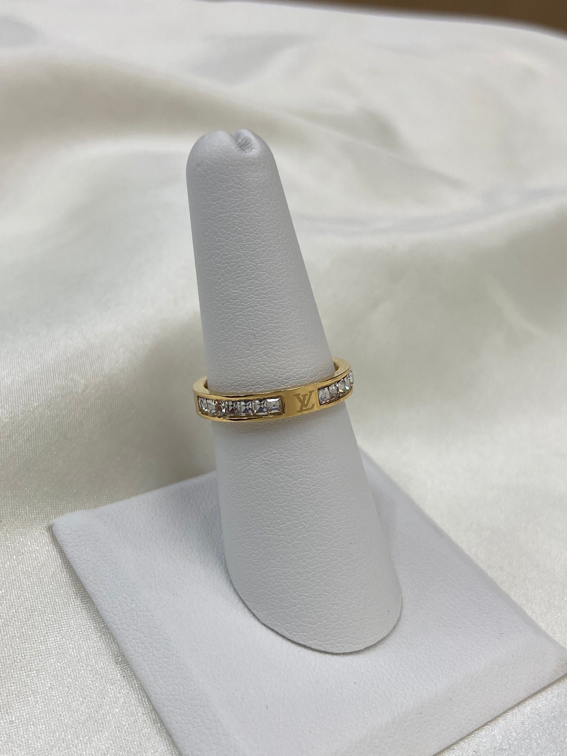 LV thin cz stainless steel gold ring that is high quality, non tarnish, and water friendly. Plain band in the back. Stainless steel over gold plating