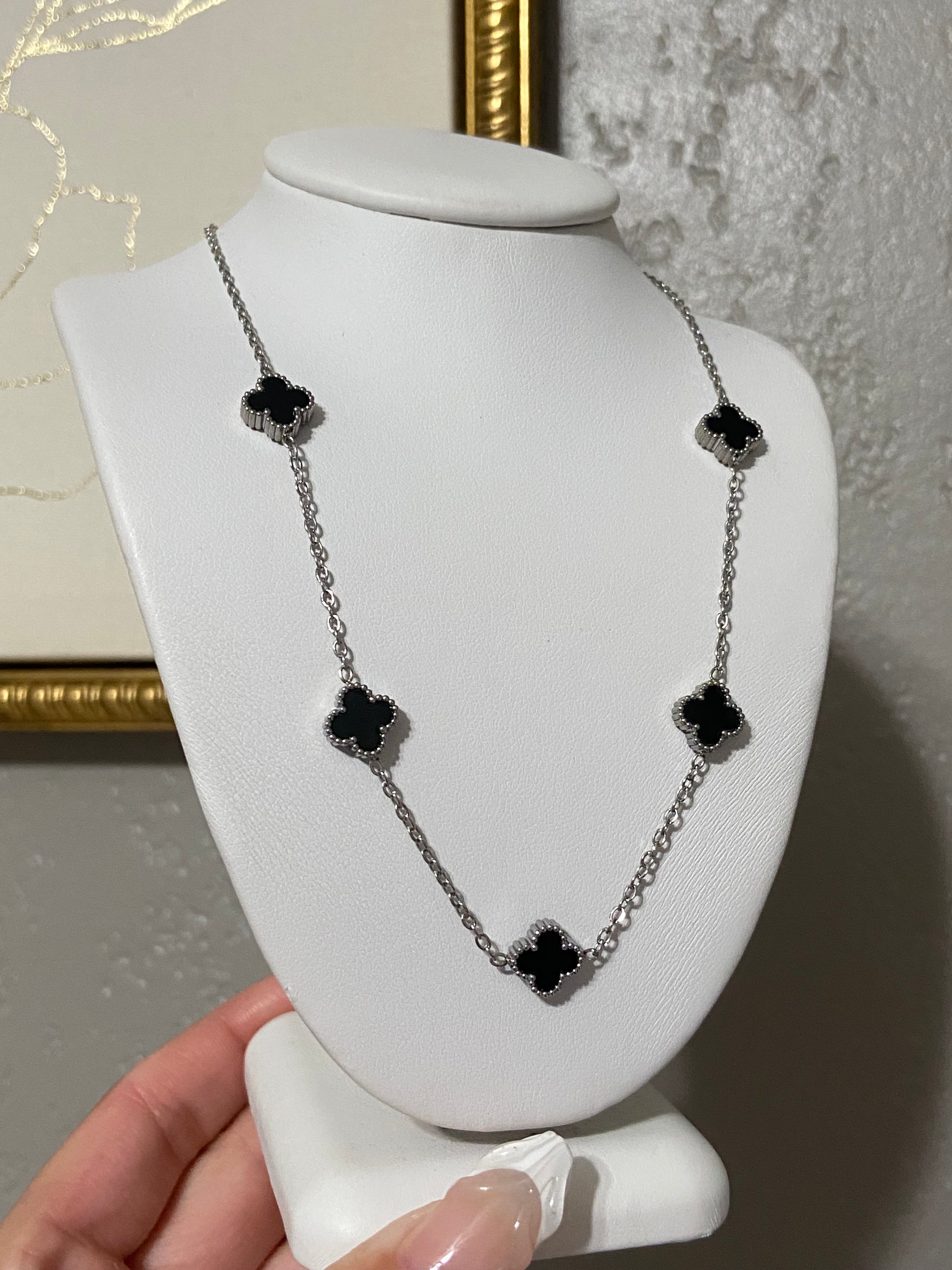 Mini black clovers stainless steel silver necklace that is high quality, non tarnish, and water friendly.