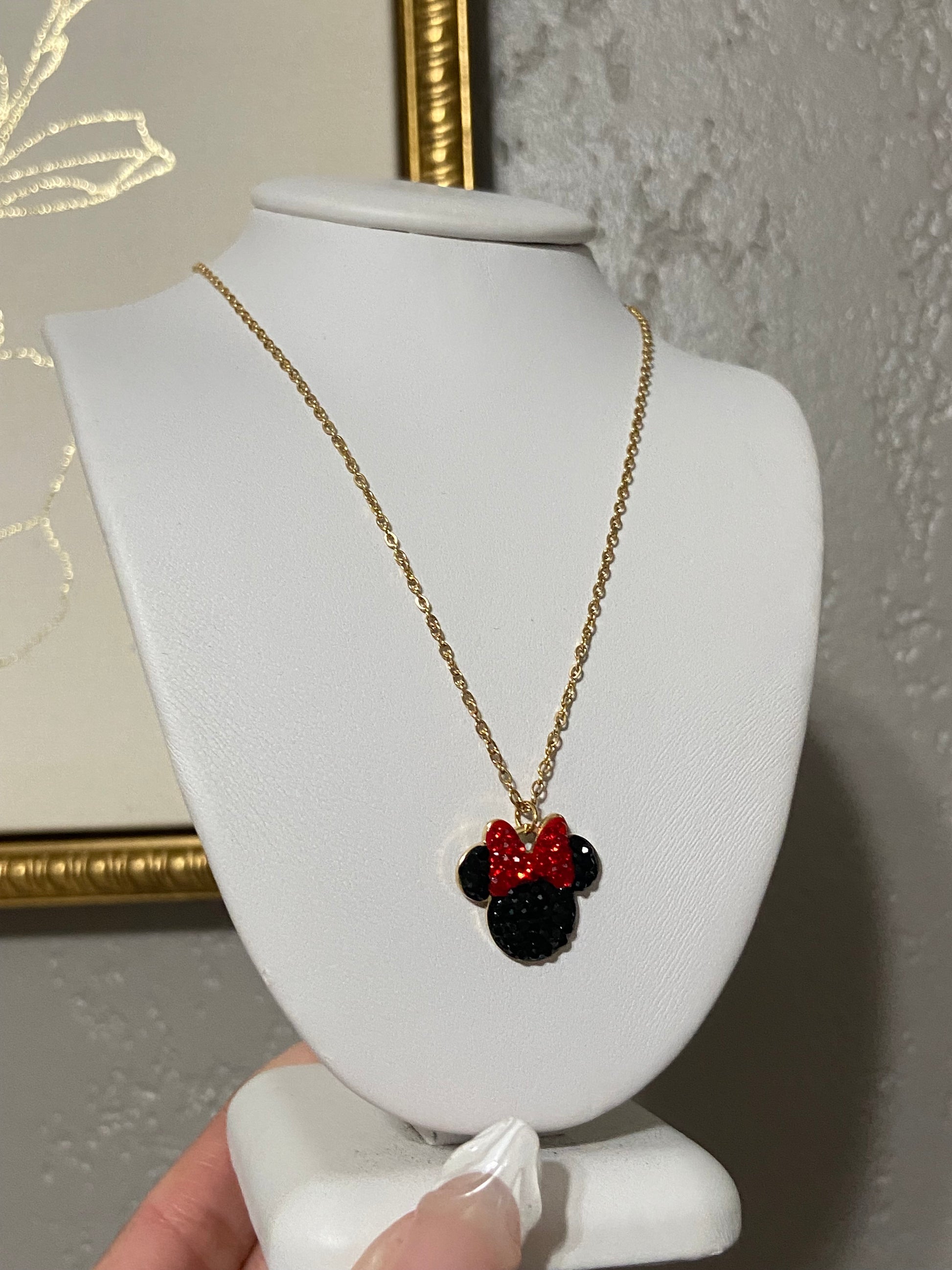 Minnie cz stainless steel gold necklace that is non tarnish and water friendly. Stainless steel over gold plating necklace. Has an extender clasp. Pendant is plain in the back.