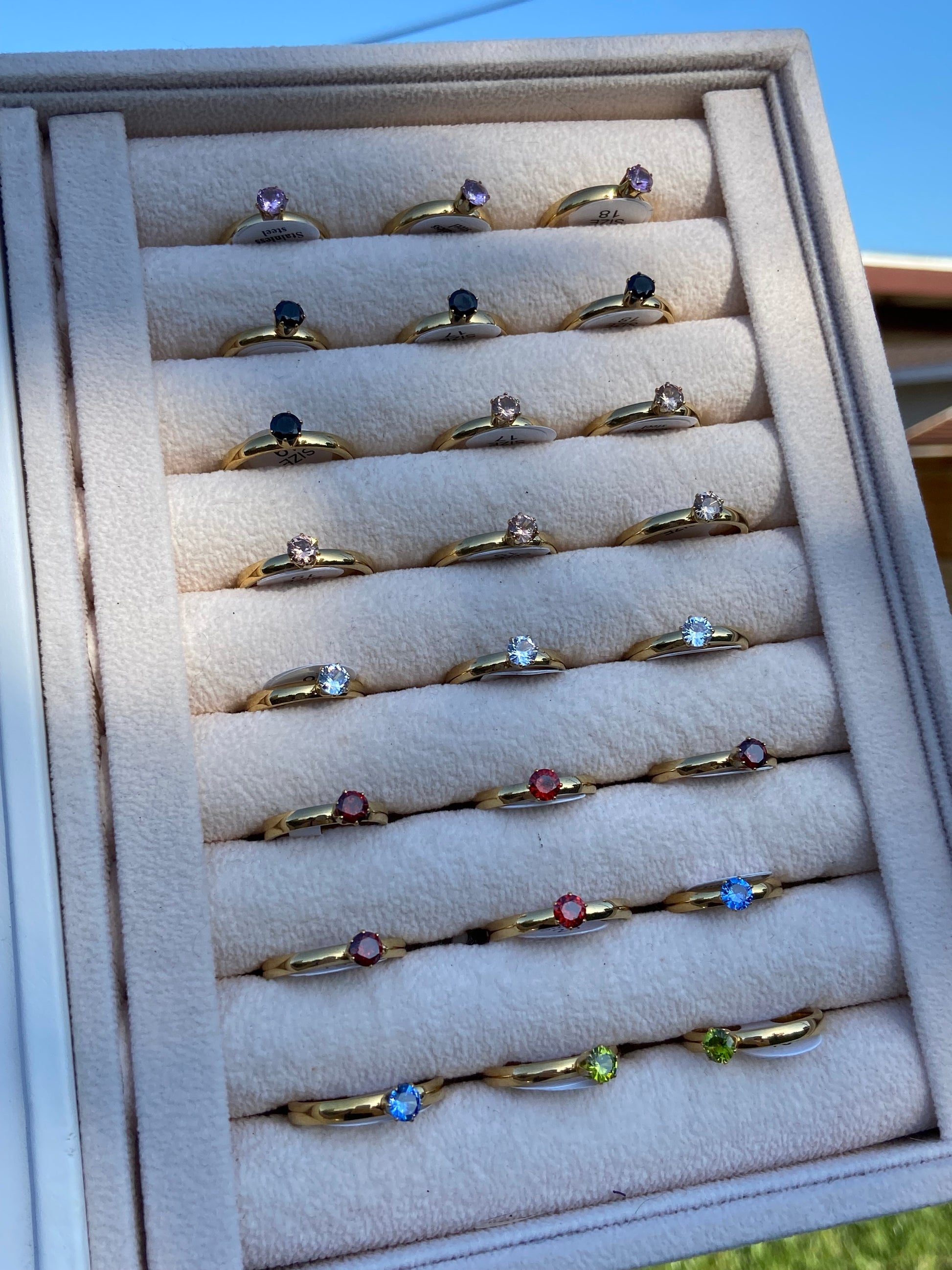 Birthstone stainless steel gold rings that are high quality, non tarnish, and water friendly. Available in many different birthstone colors.
