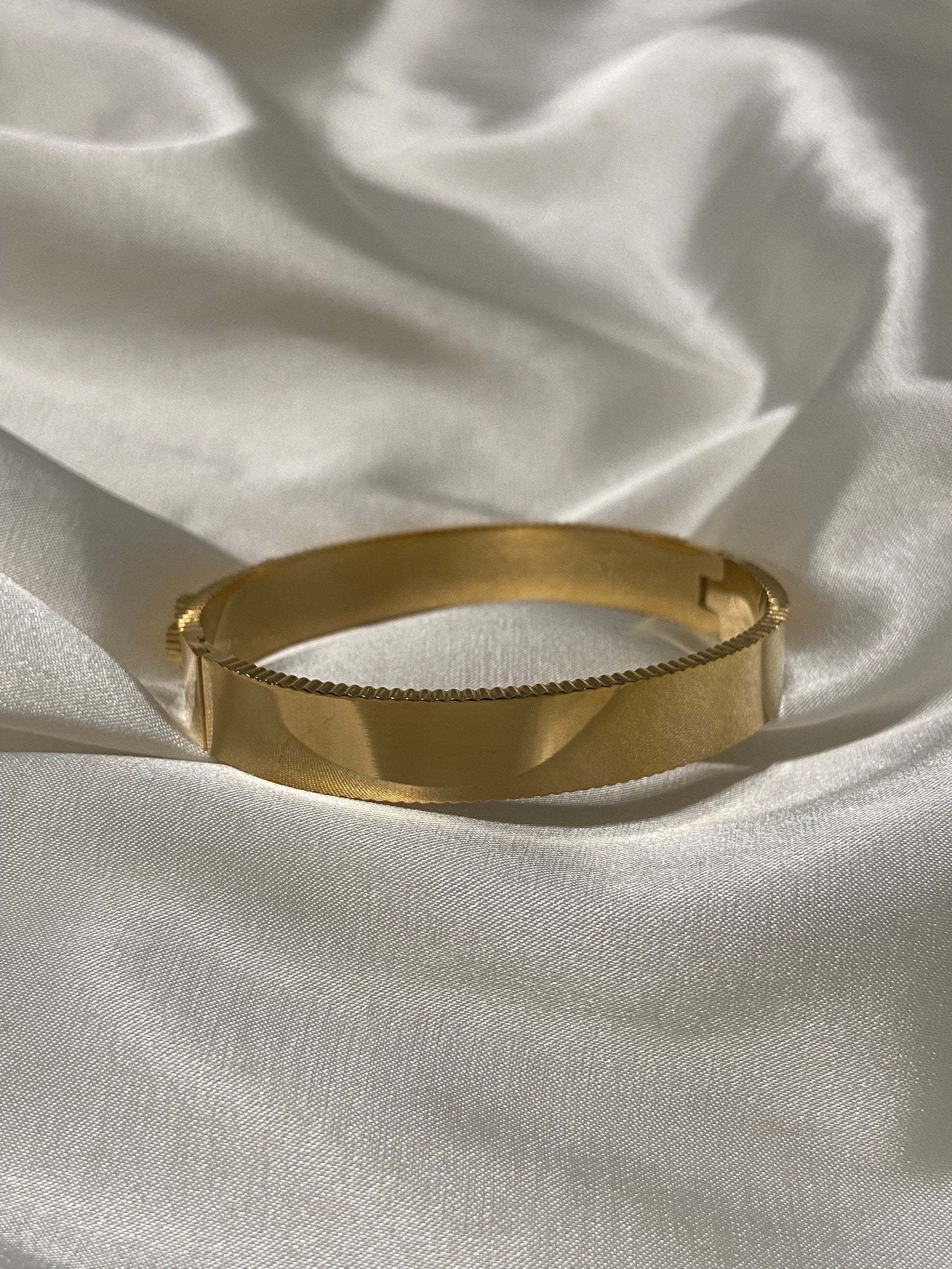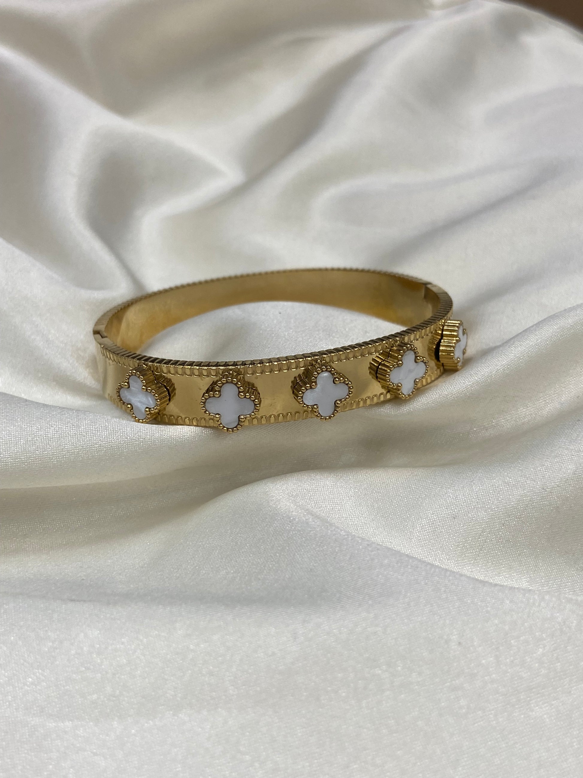Multi clovers stainless steel gold bangle that is high quality, non tarnish, and water friendly. Stainless steel over gold plating. Plain the back. Five clover detailing.