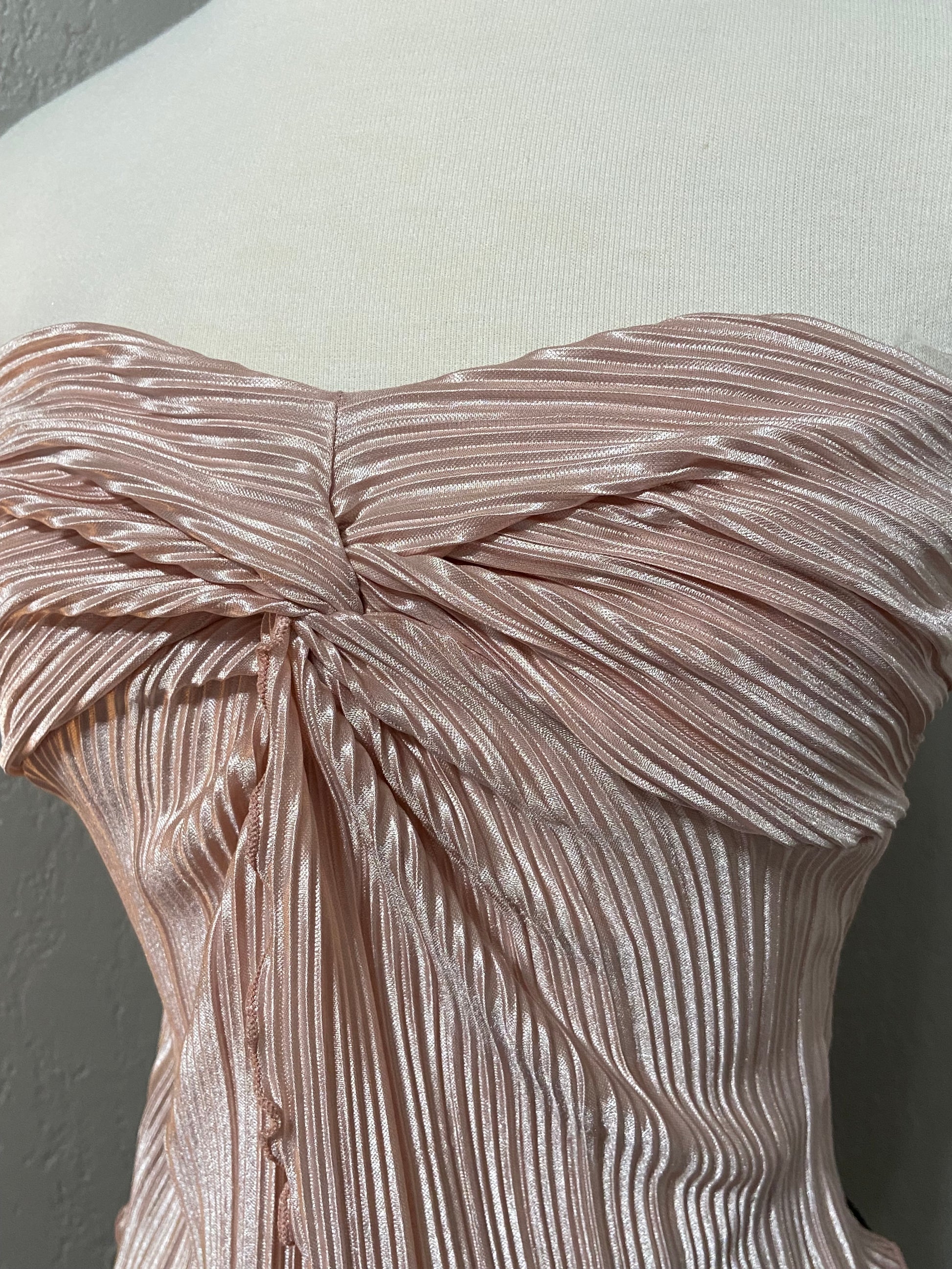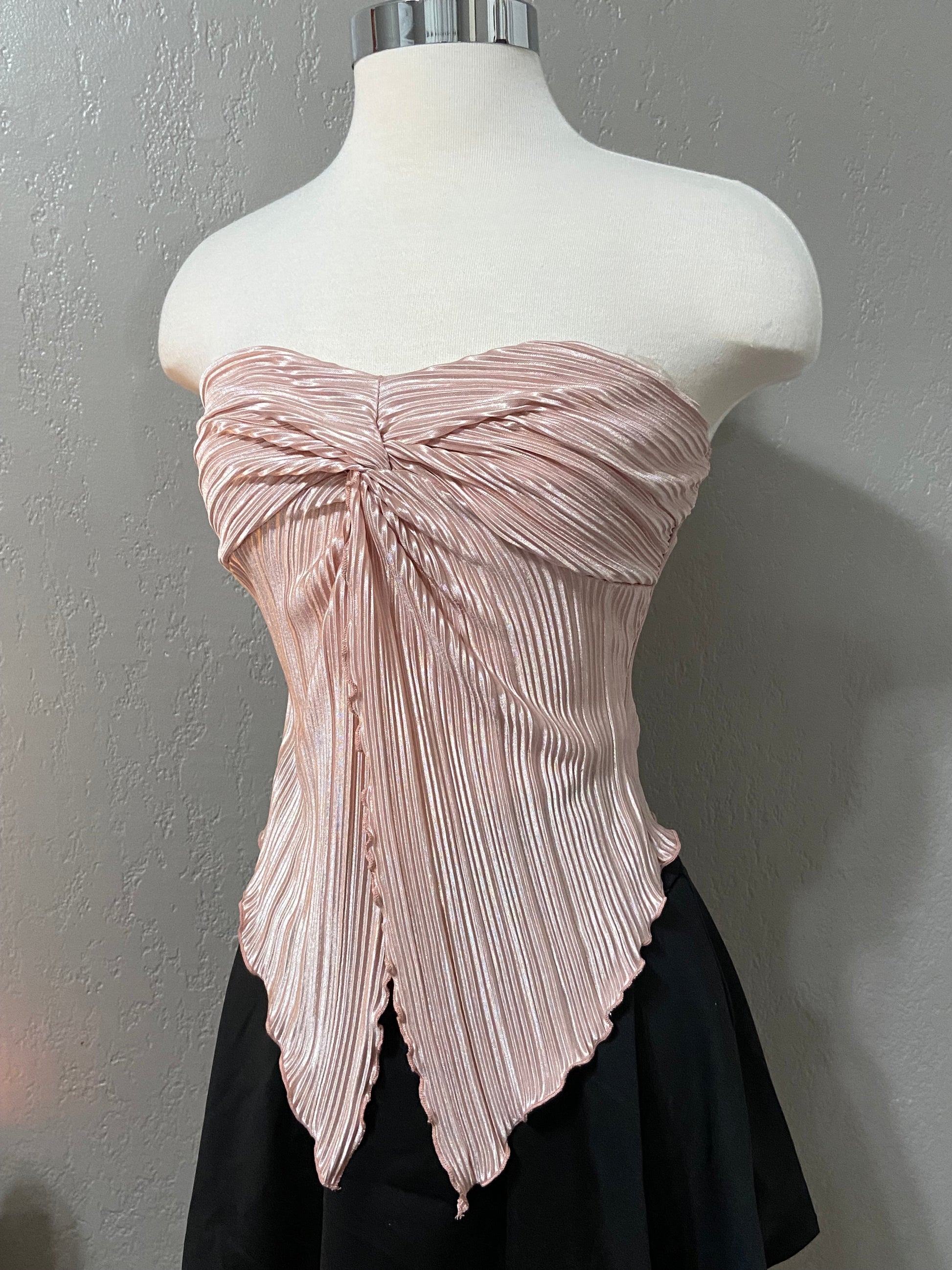 Pink twist front ribbed tube top with a satin fabric. Minimal stretch. Straight back.