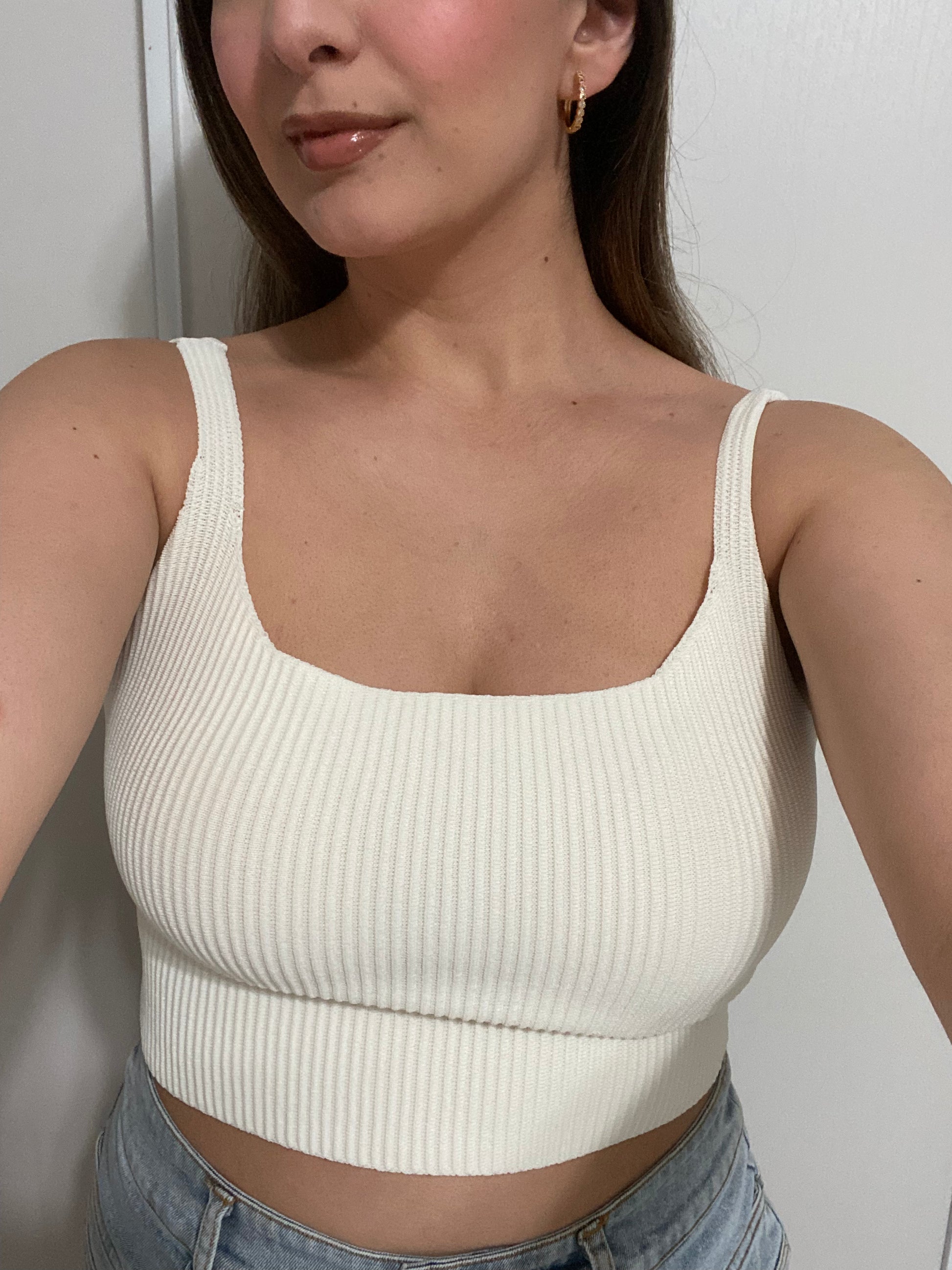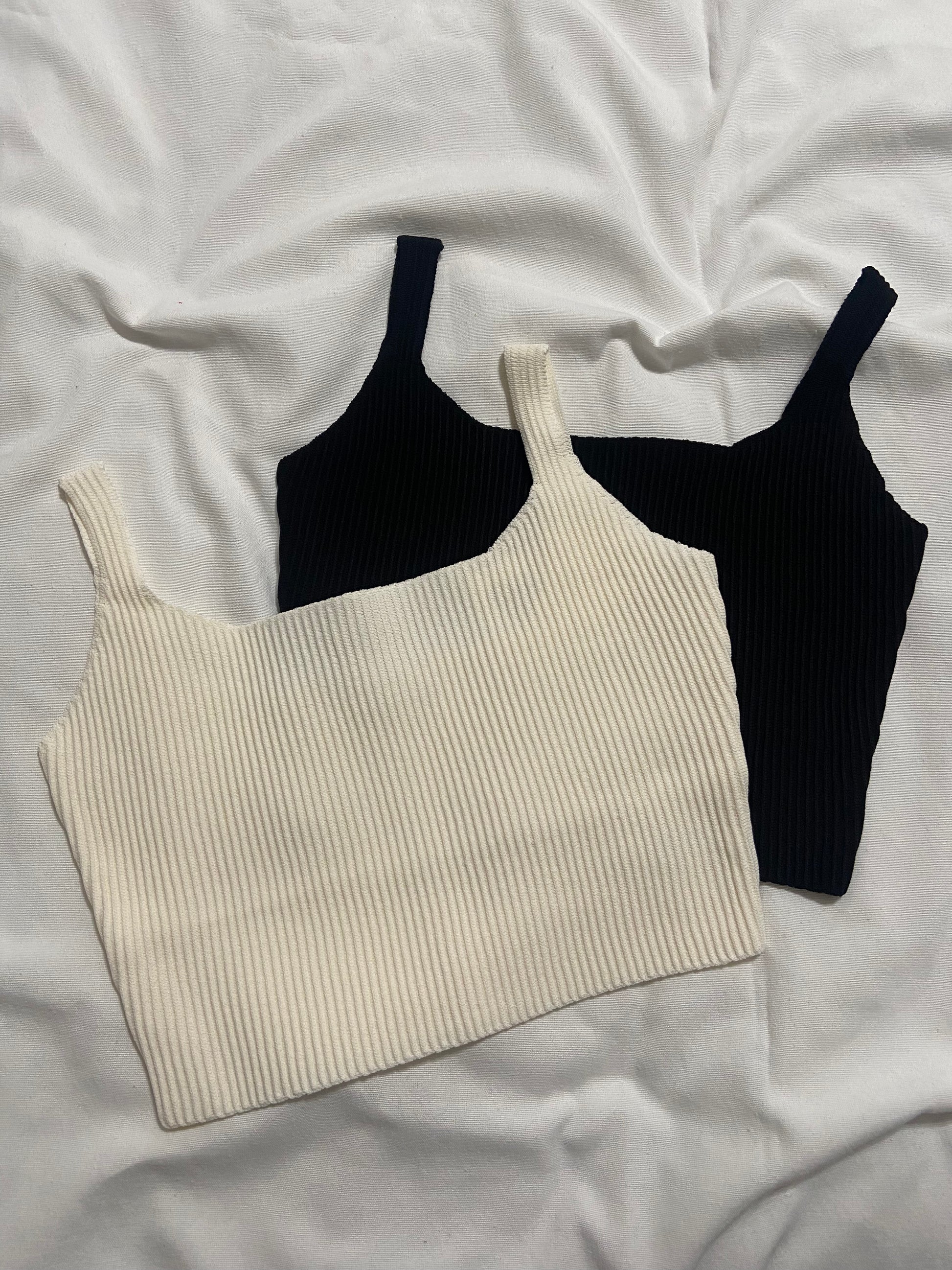 Ribbed sweater knit cropped cami tank top with a square neckline thats very thick and not see through. Stretchy. Available in 2 colors: black & cream.