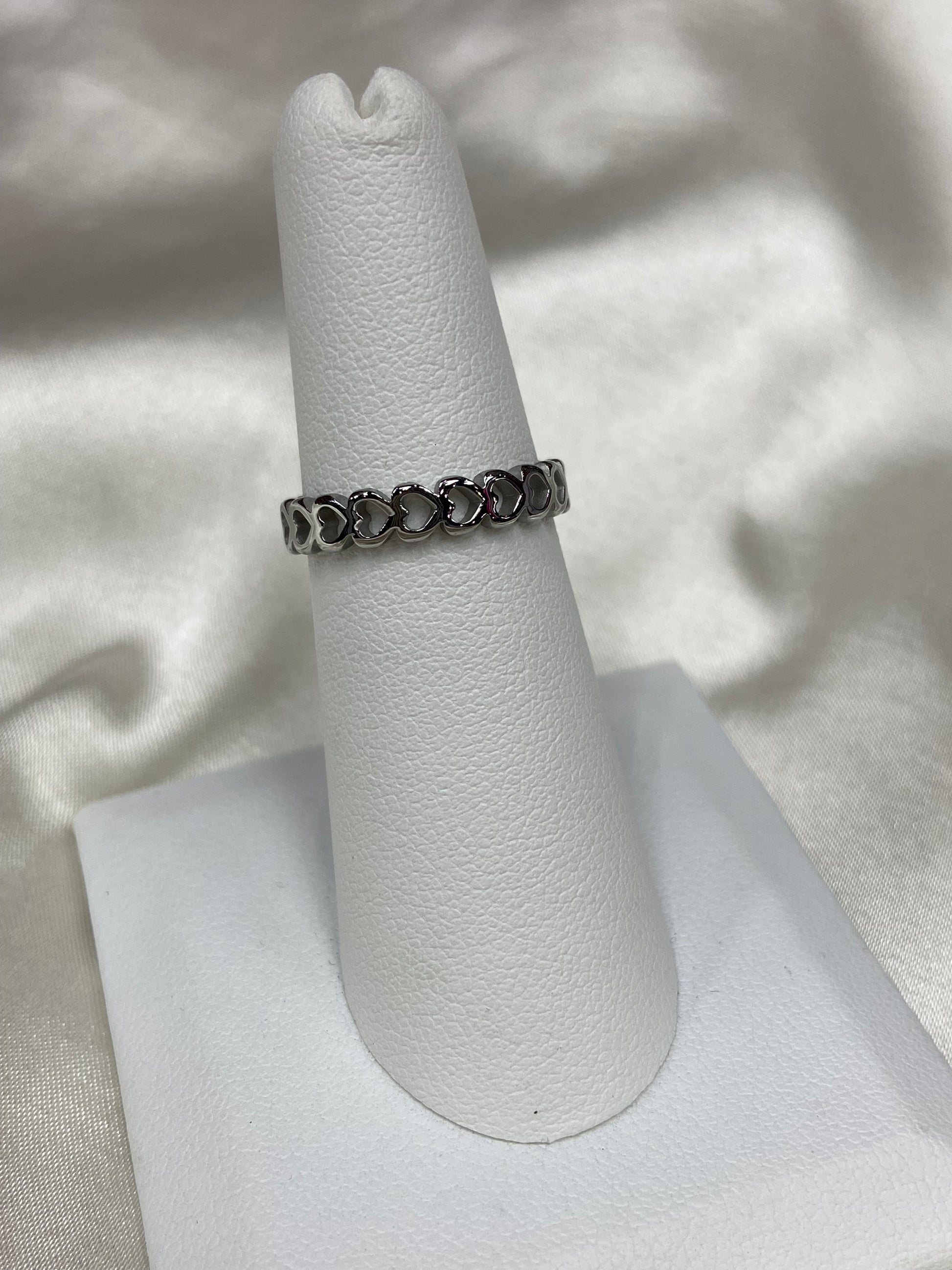 Side hearts stainless steel silver ring that is non tarnish and water friendly.