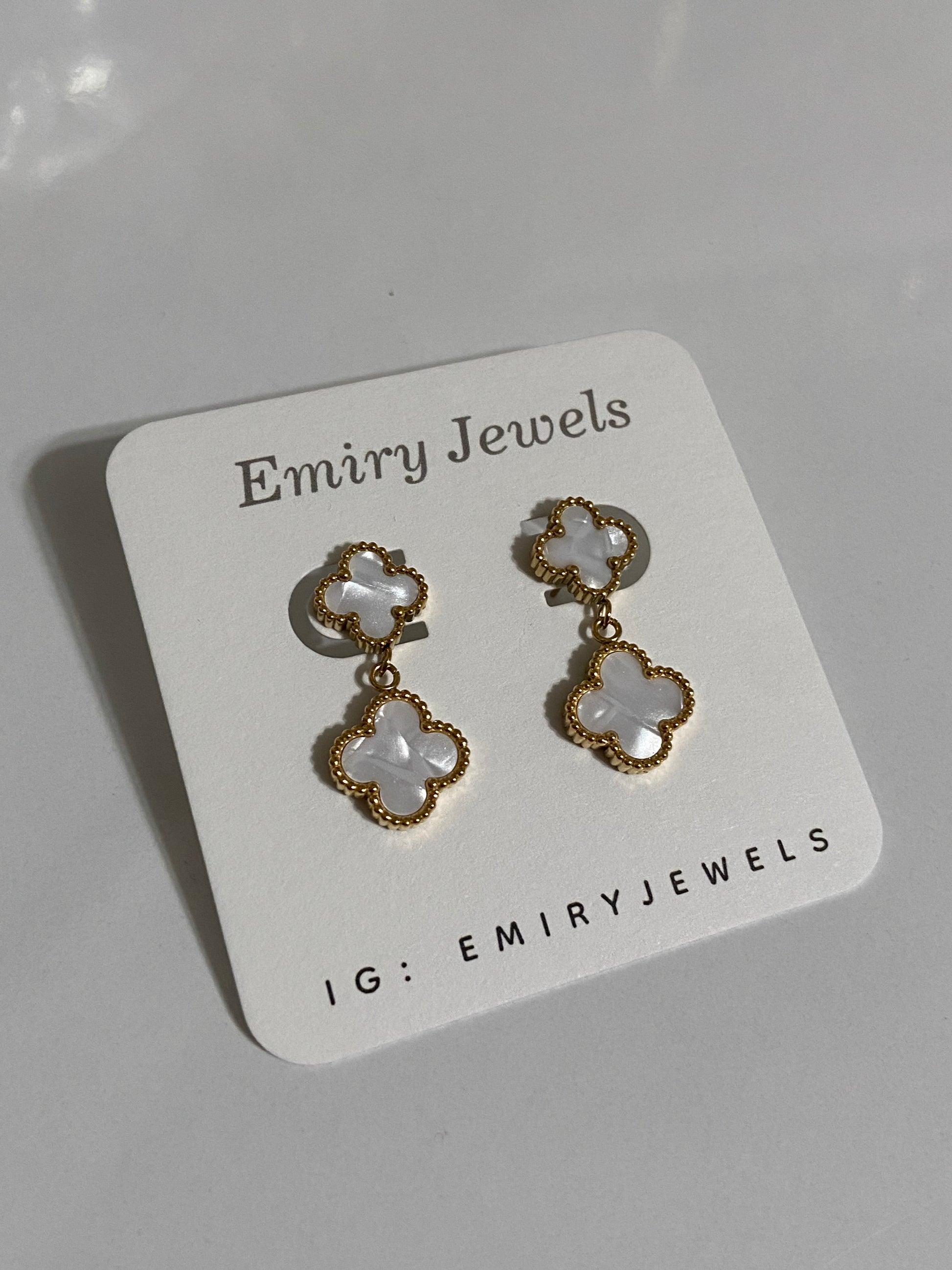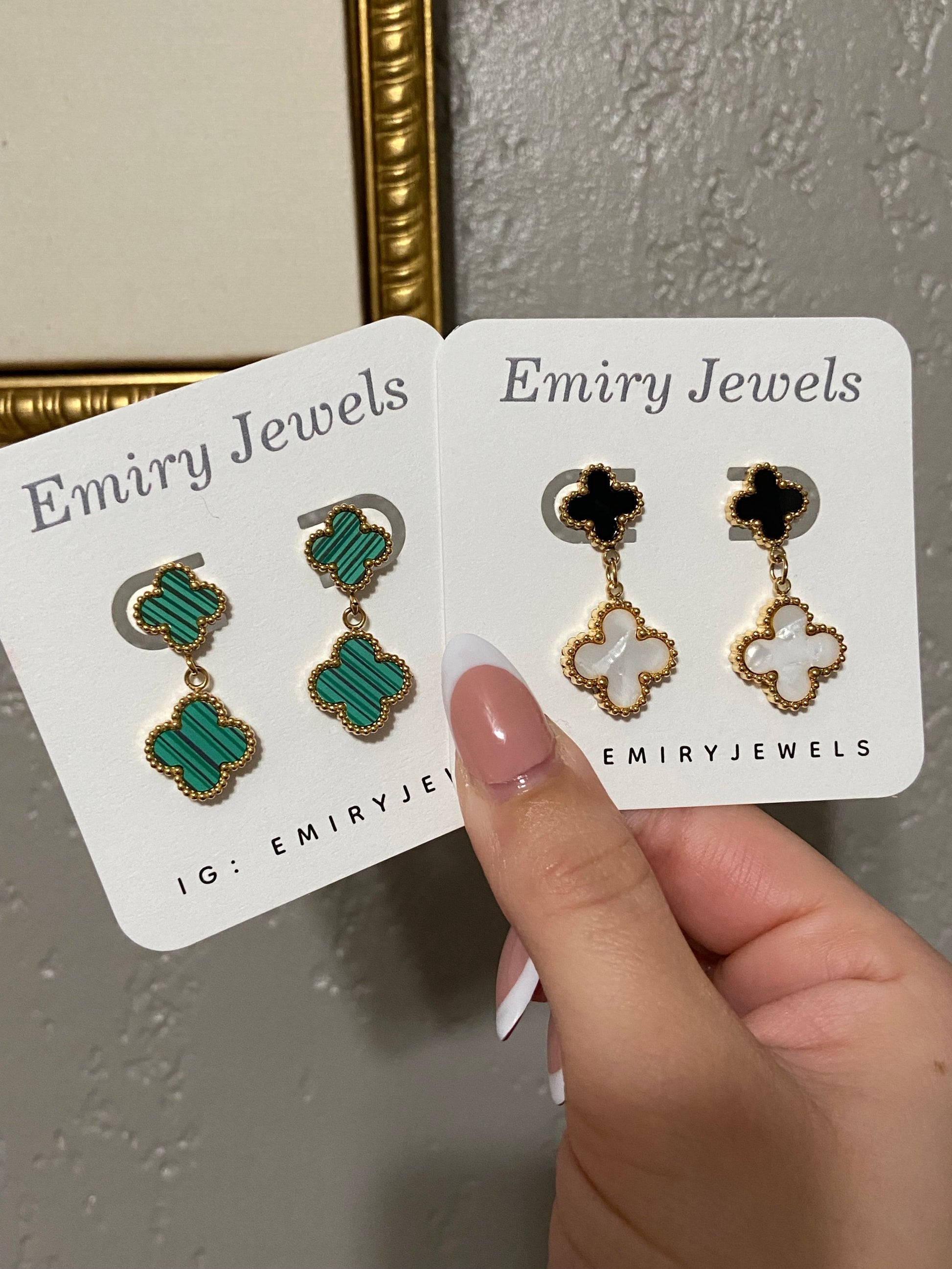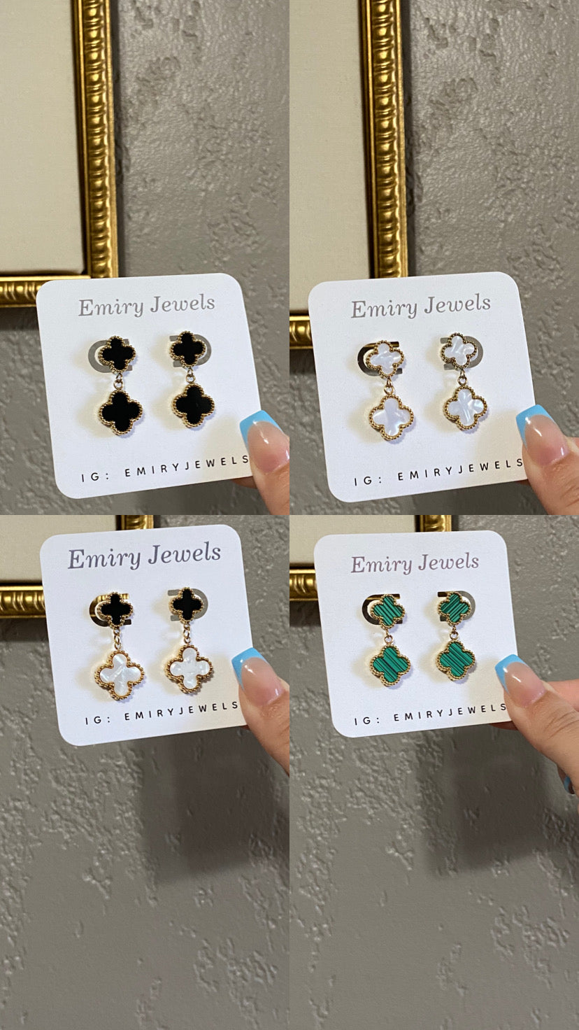 Double clovers stainless steel drop earrings that are high quality, non tarnish, and water friendly. Stainless steel over gold plating. Available in 2 colors: black & white mother of pearl. Comes with a box.