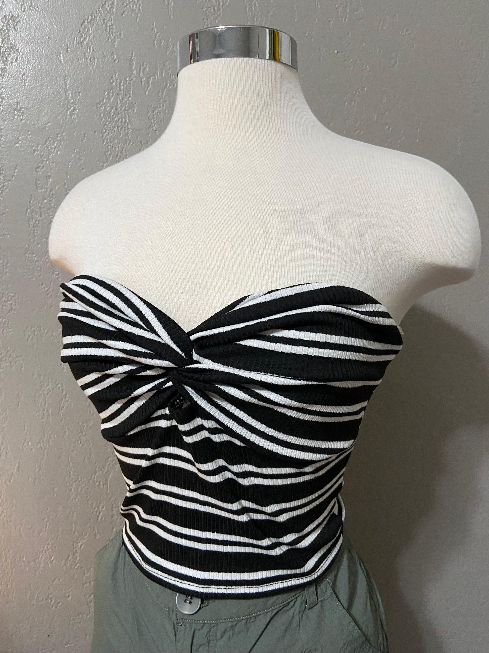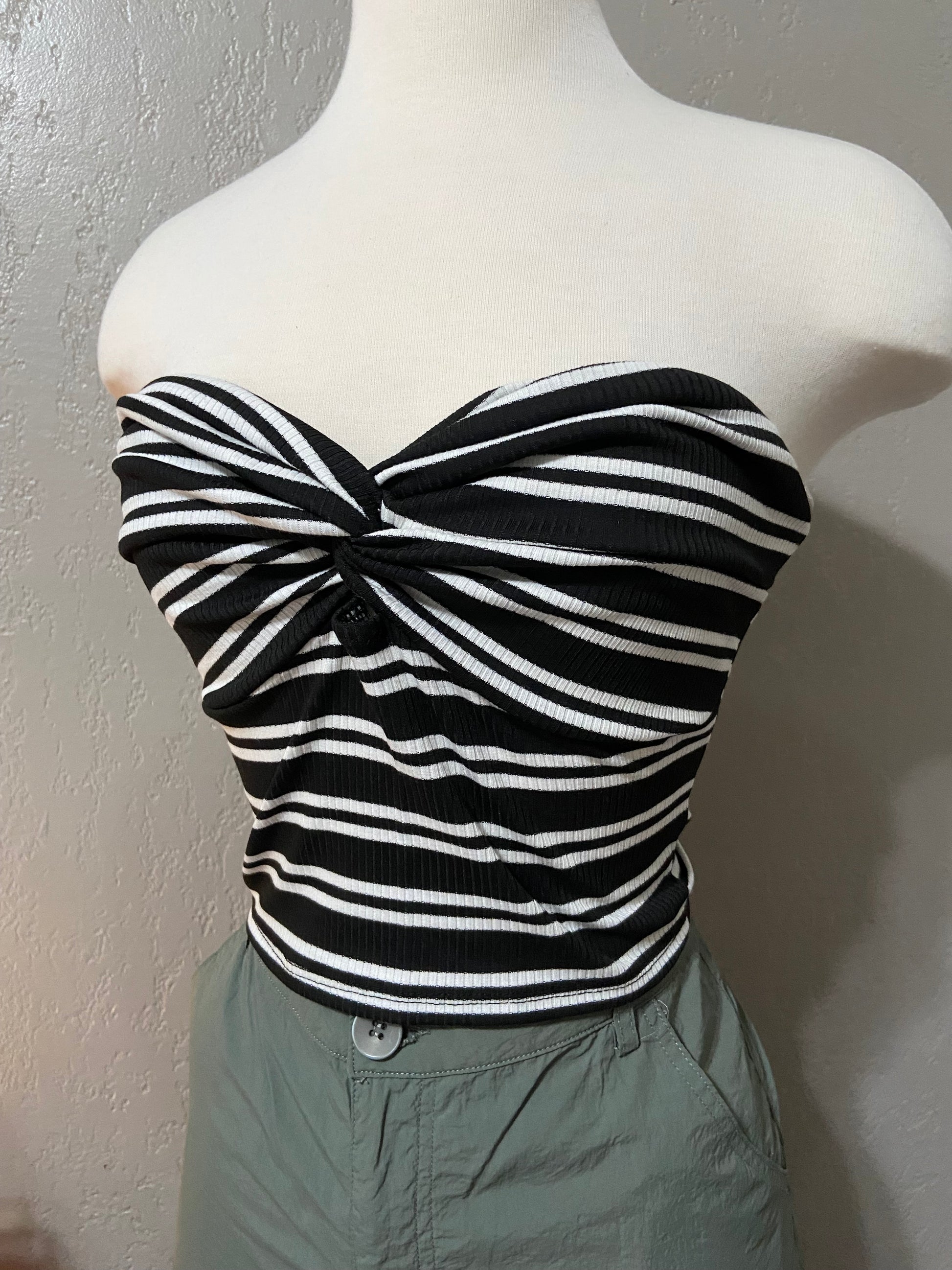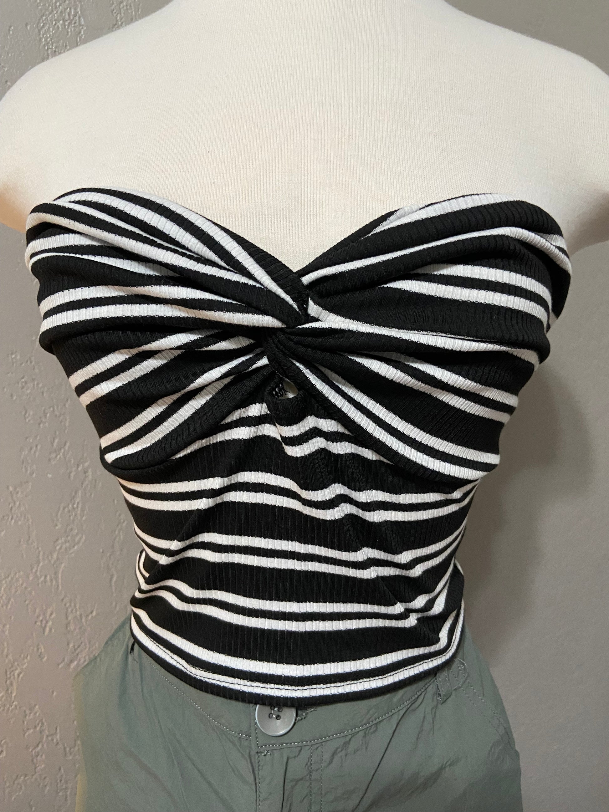 Stripe knit tube top that has a twist front detailing. Stretchy. Thick sweater like material. Not see through.