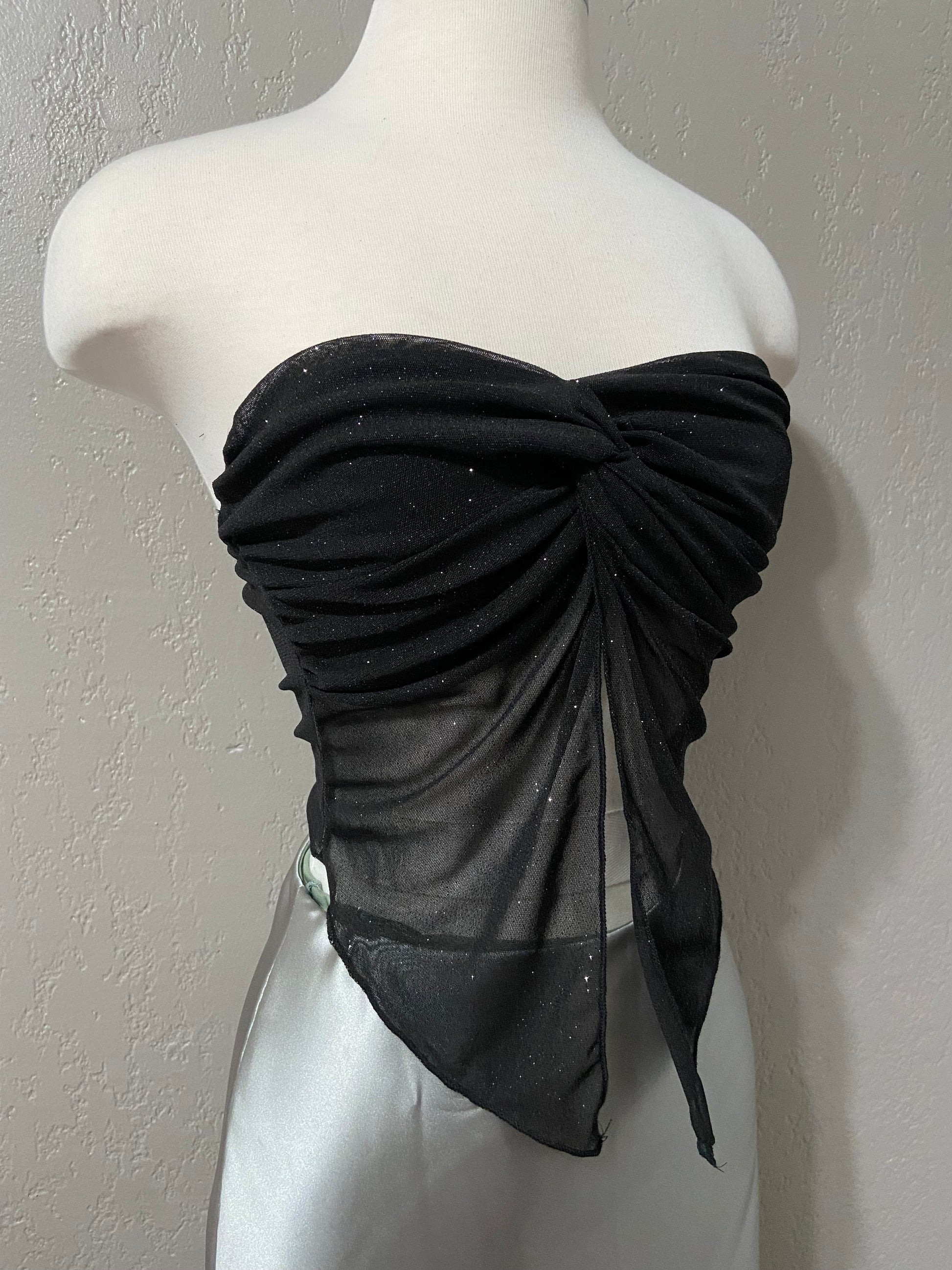 Black glitter butterfly tube top that can be dressed up or down. Bra cup area is double lined. Mesh material. Has stretch.