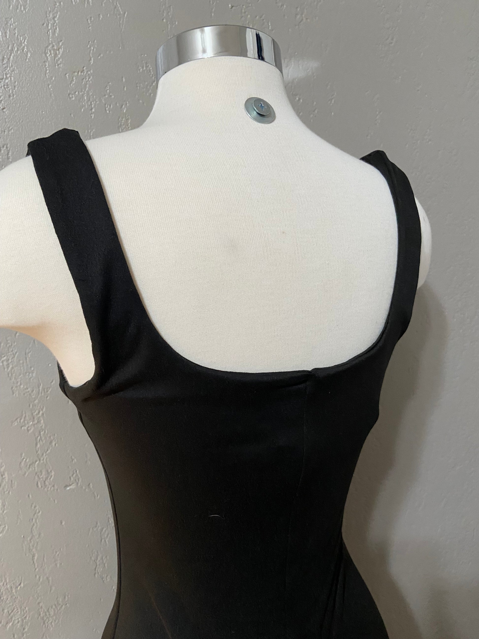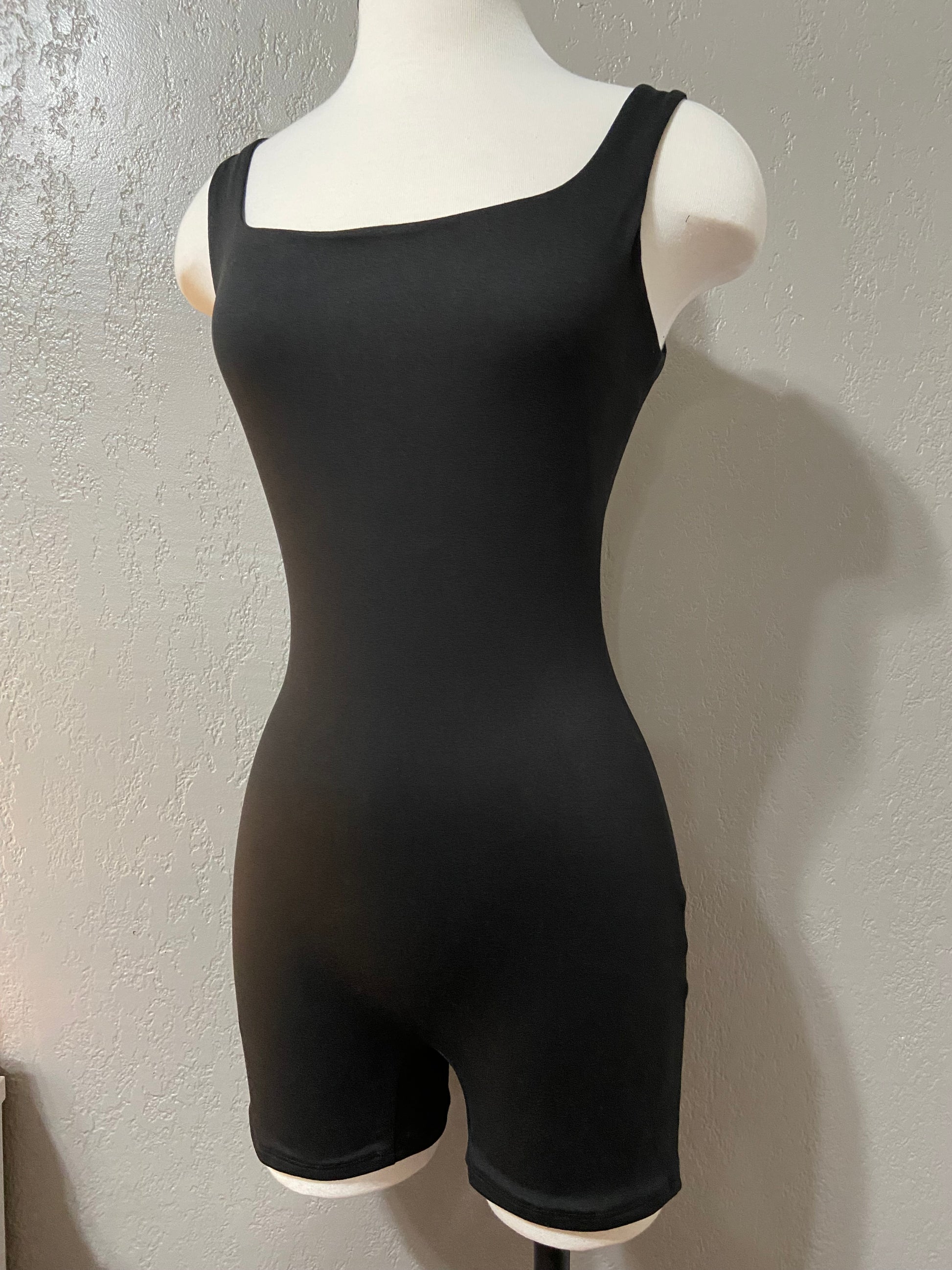 Black double layered tank romper that’s stretchy. Biker short length. Scoop neckline.