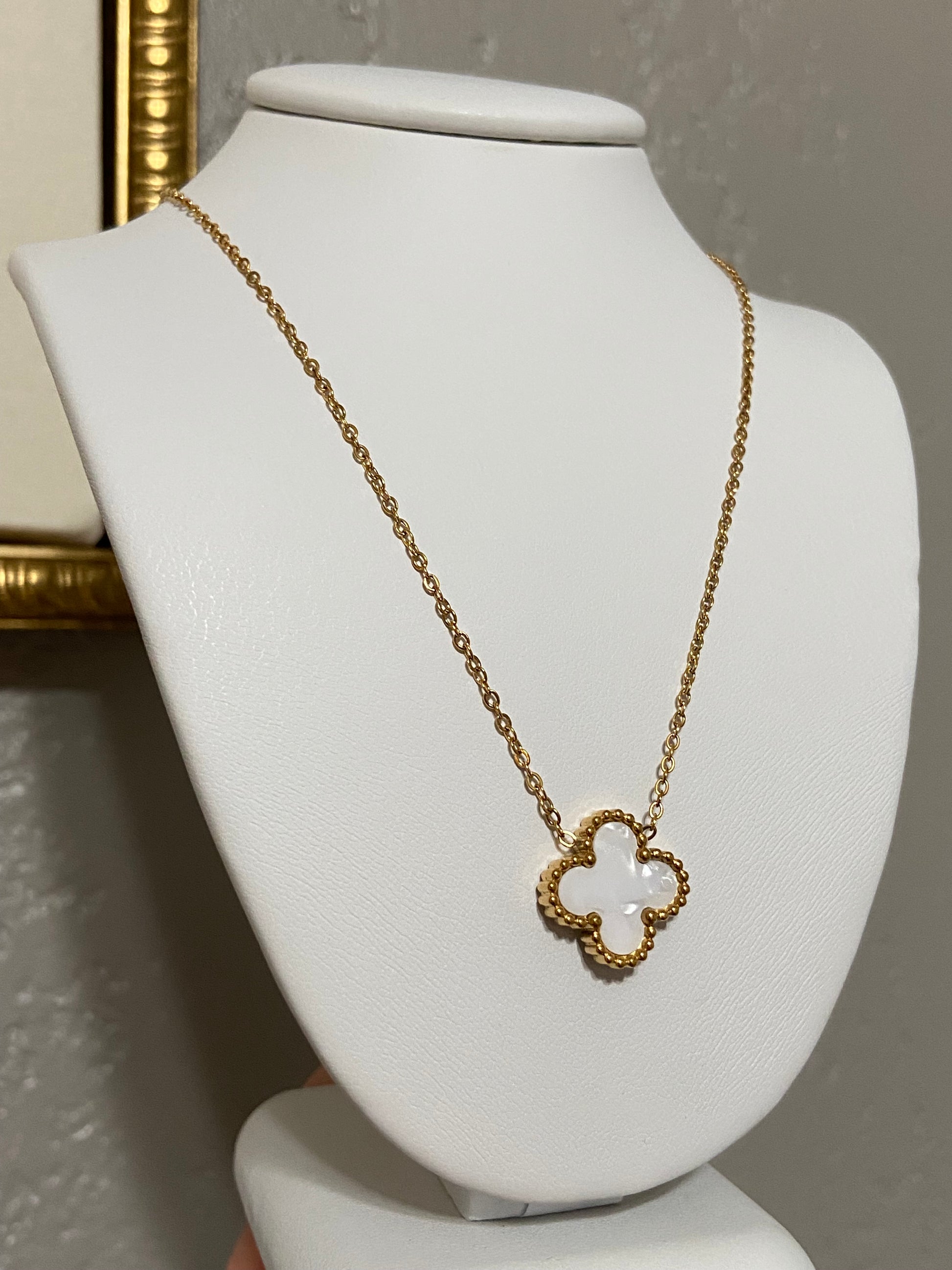 Mother of Pearl white clover stainless steel gold necklace that is reversible. Double sided clover necklace. High quality necklace that is non tarnish and water friendly. Matching earrings and bracelet available.