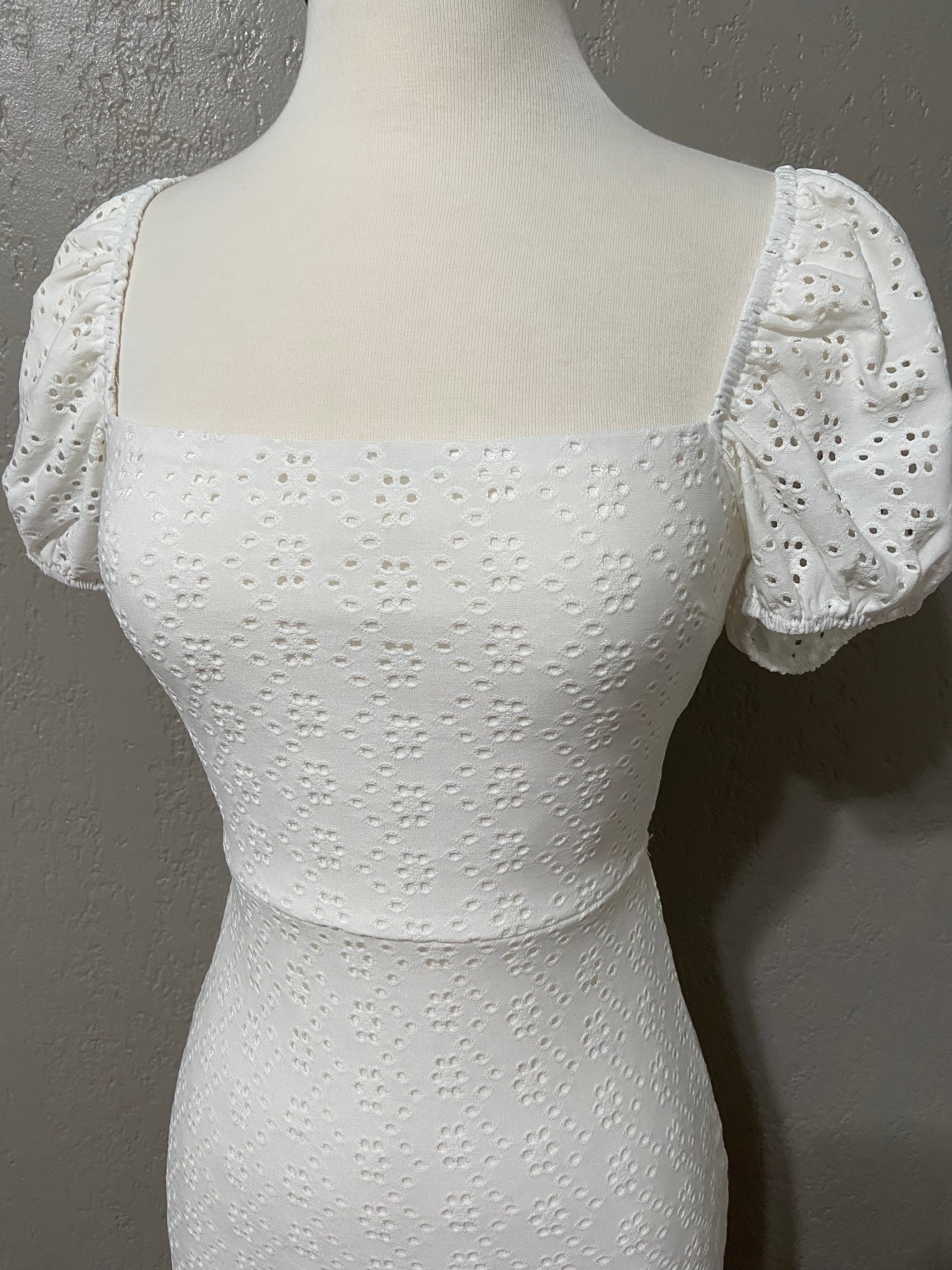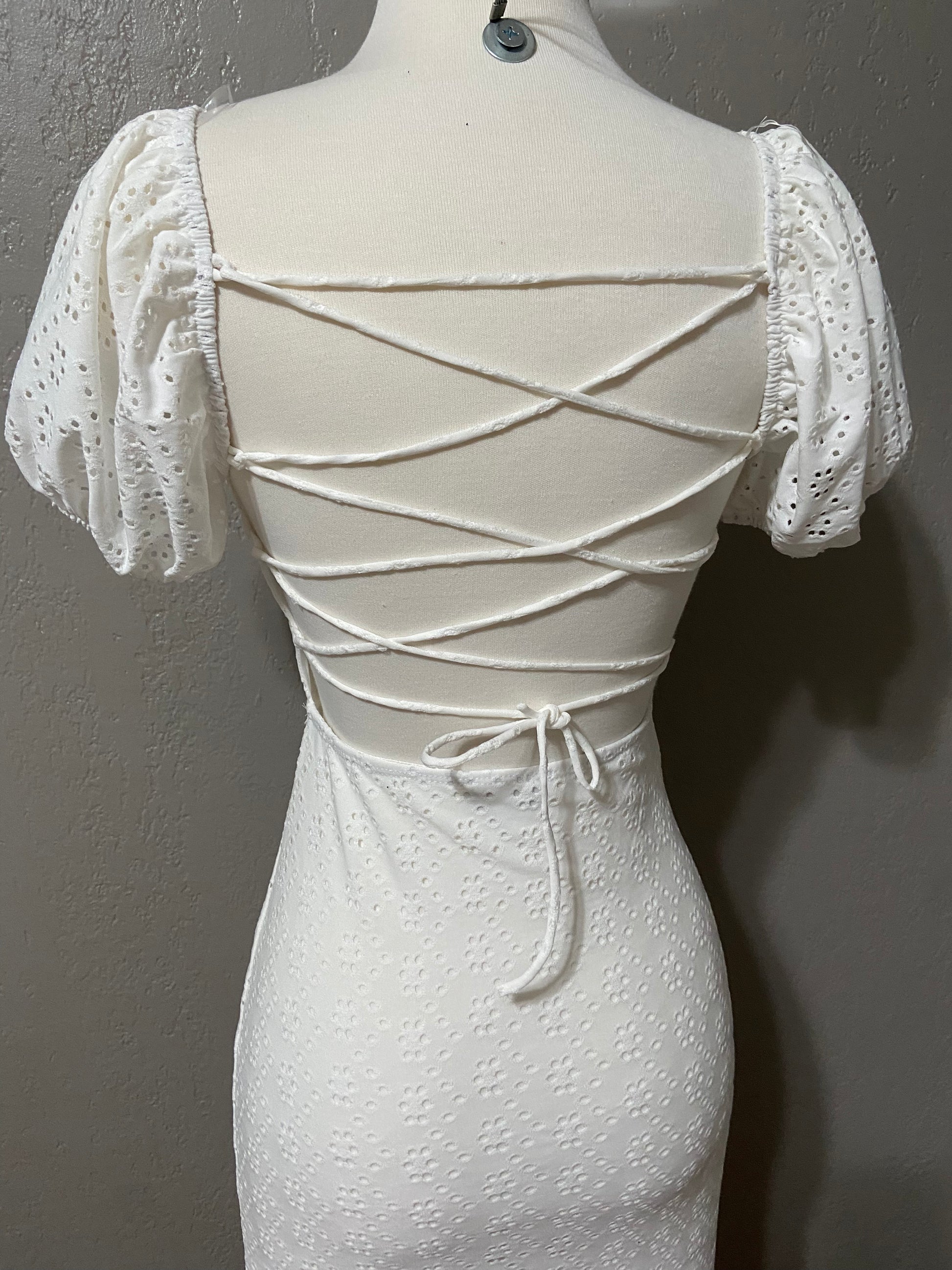 White bodycon mini dress with puffy sleeve. Square-neck front. Open tie back. Eyelet material.